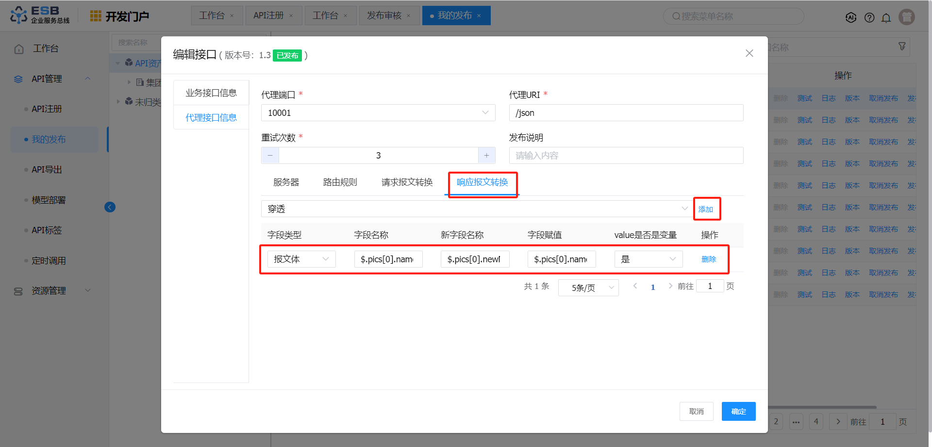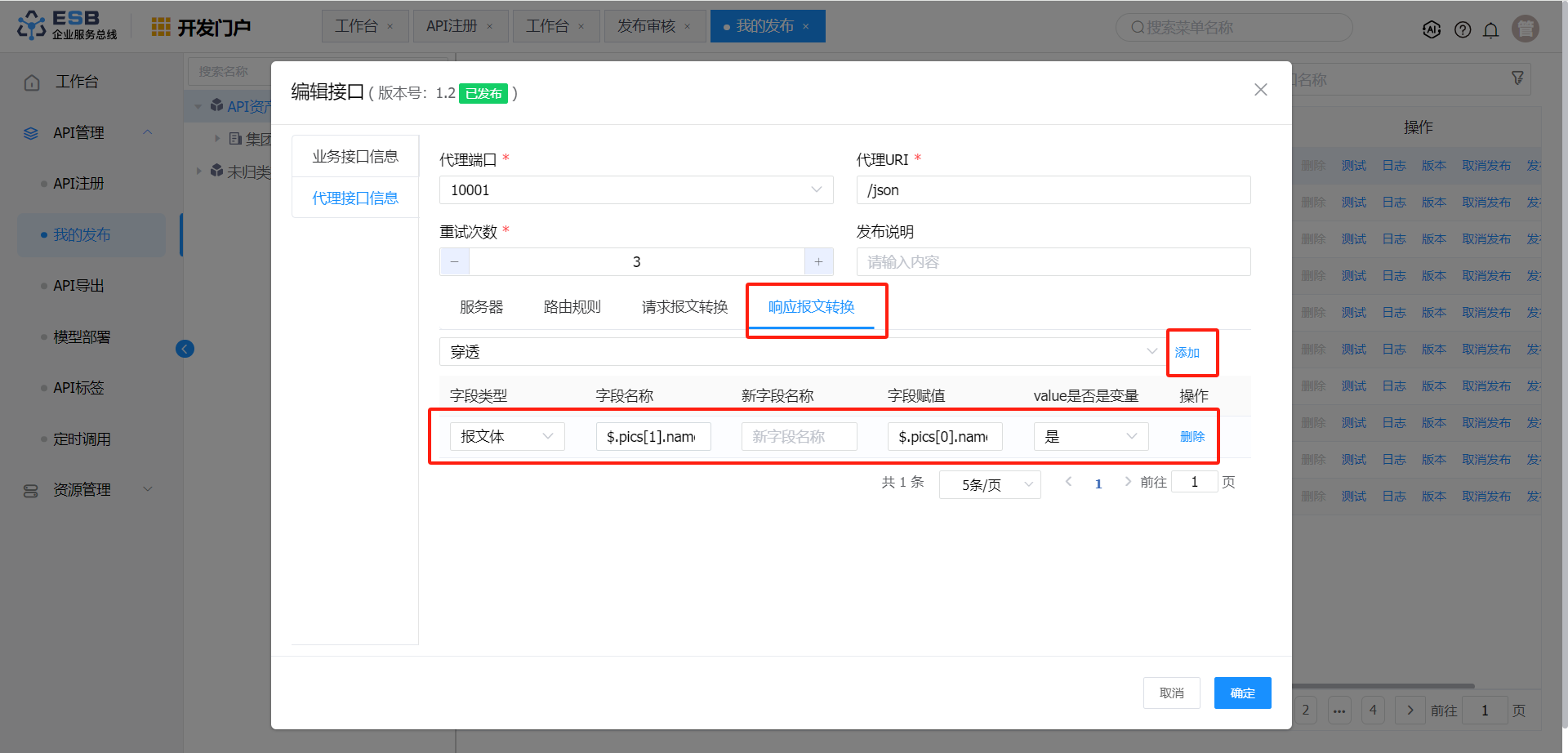 响应报文转换 报文体 $.pics[1].name 图片2-修改 否