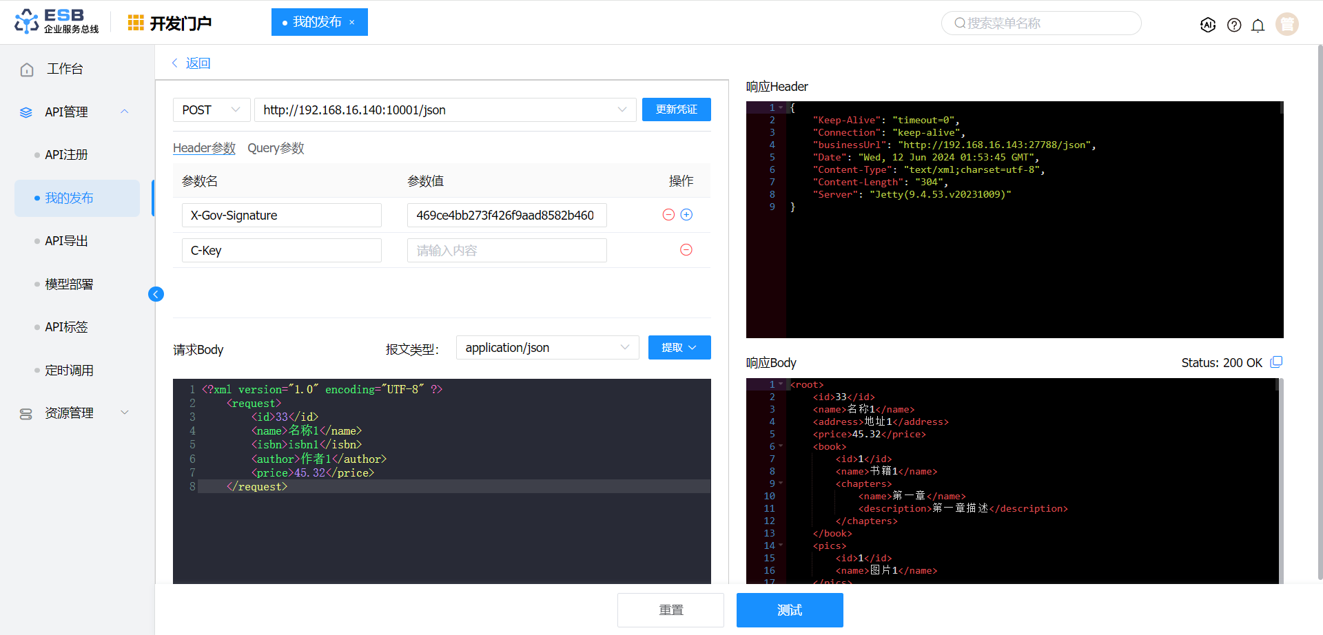 在测试页面,在“请求Body”中填写请求报文,点击“测试”按钮,即可查看到转换后的响应报文。