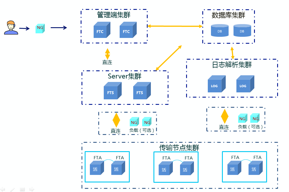 此章节介绍代理节点简单部署(6台服务器),集群部署(9台服务器)以及文件传输产品代理节点模块内容简介
