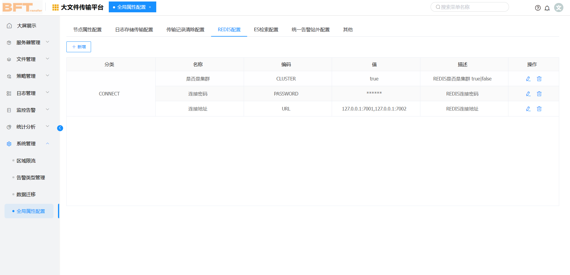 在BFT Console中点击菜单【系统管理】>【全局属性配置】,右侧区域显示 "全局属性配置" 界面: