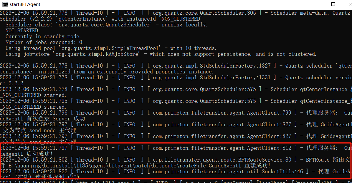 代理服务器(BFTAgent)在控制管理中心已注册,运行“{BFTAgent安装目录}\startBFTAgent.cmd”,出现以下内容,表示BFT Agent启动成功: