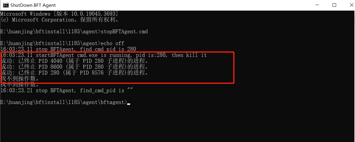 运行“{BFTAgent安装目录}\stopBFTAgent.cmd”,出现以下内容,表示BFT Agent停止成功: