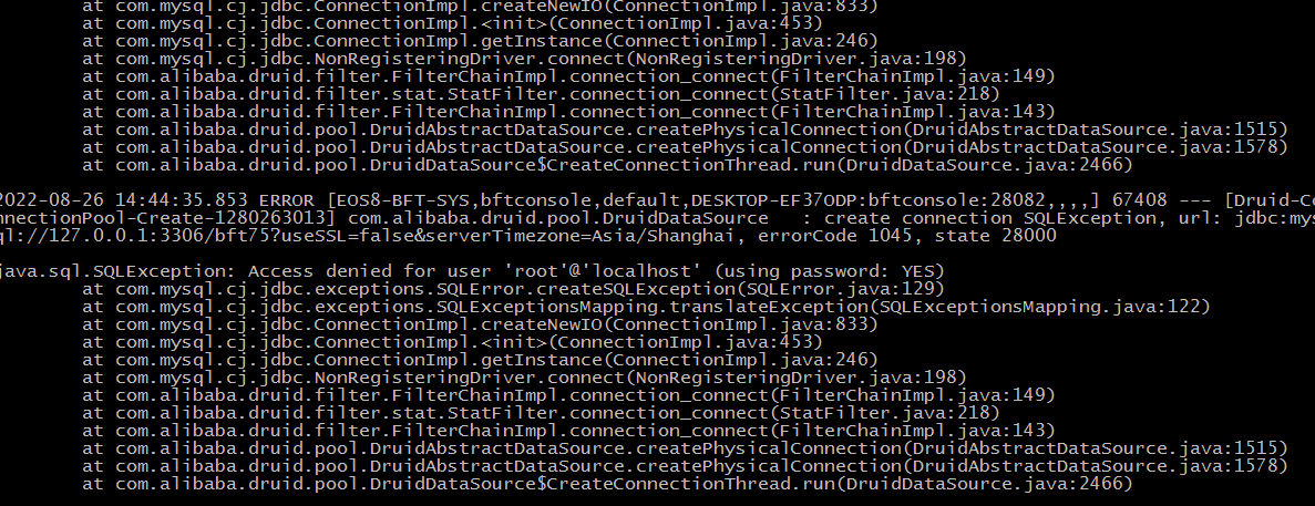 解决问题:修改配置文件({BFTConsole安装目录}\config\BFT_AFC_CONSOLE\config\user-config.xml)中数据库用户名或者密码,再次启动服务