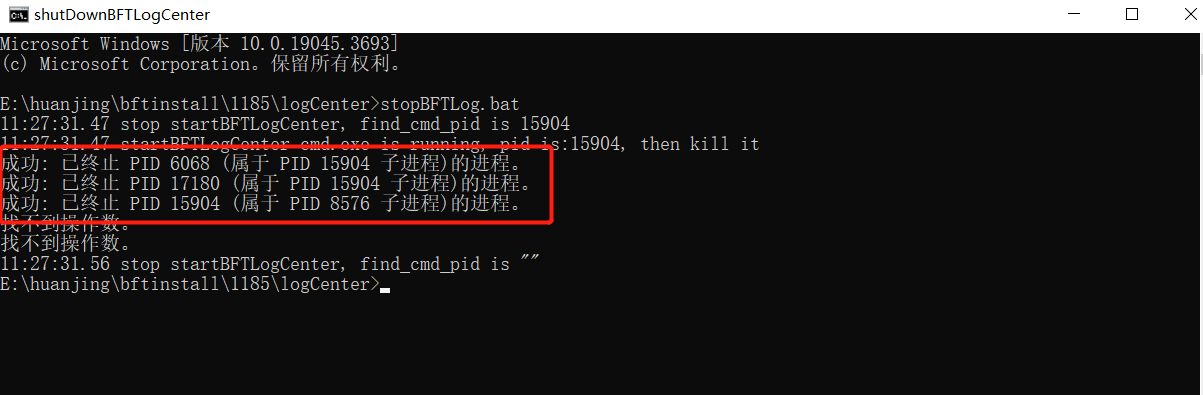 运行“{BFTLogcenter安装目录}\stopBFTLog.bat”,出现以下内容,表明BFT LogCenter停止成功: