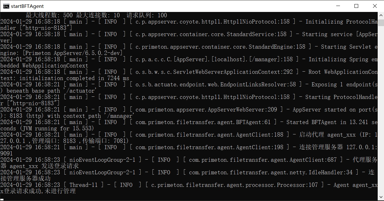启动BFT Agent,运行“D:\temp\win_install\Agent_Install\startBFTAgent.cmd”,出现以下内容,表示BFT Agent启动成功