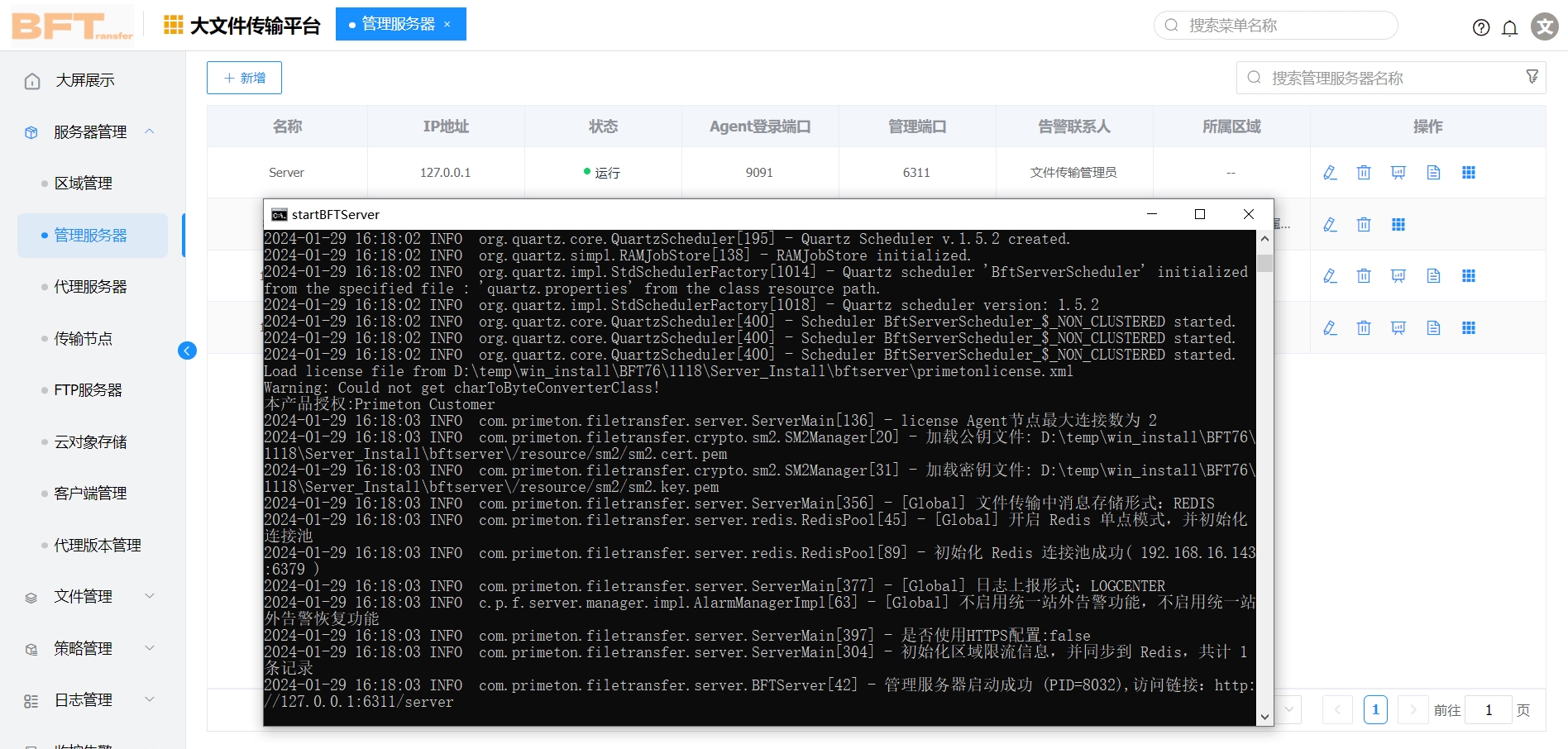 3.启动BFT Server,运行“D:\temp\win_install\Server_Install\startBFTServer.cmd”,出现以下内容,表示BFT Server启动成功
