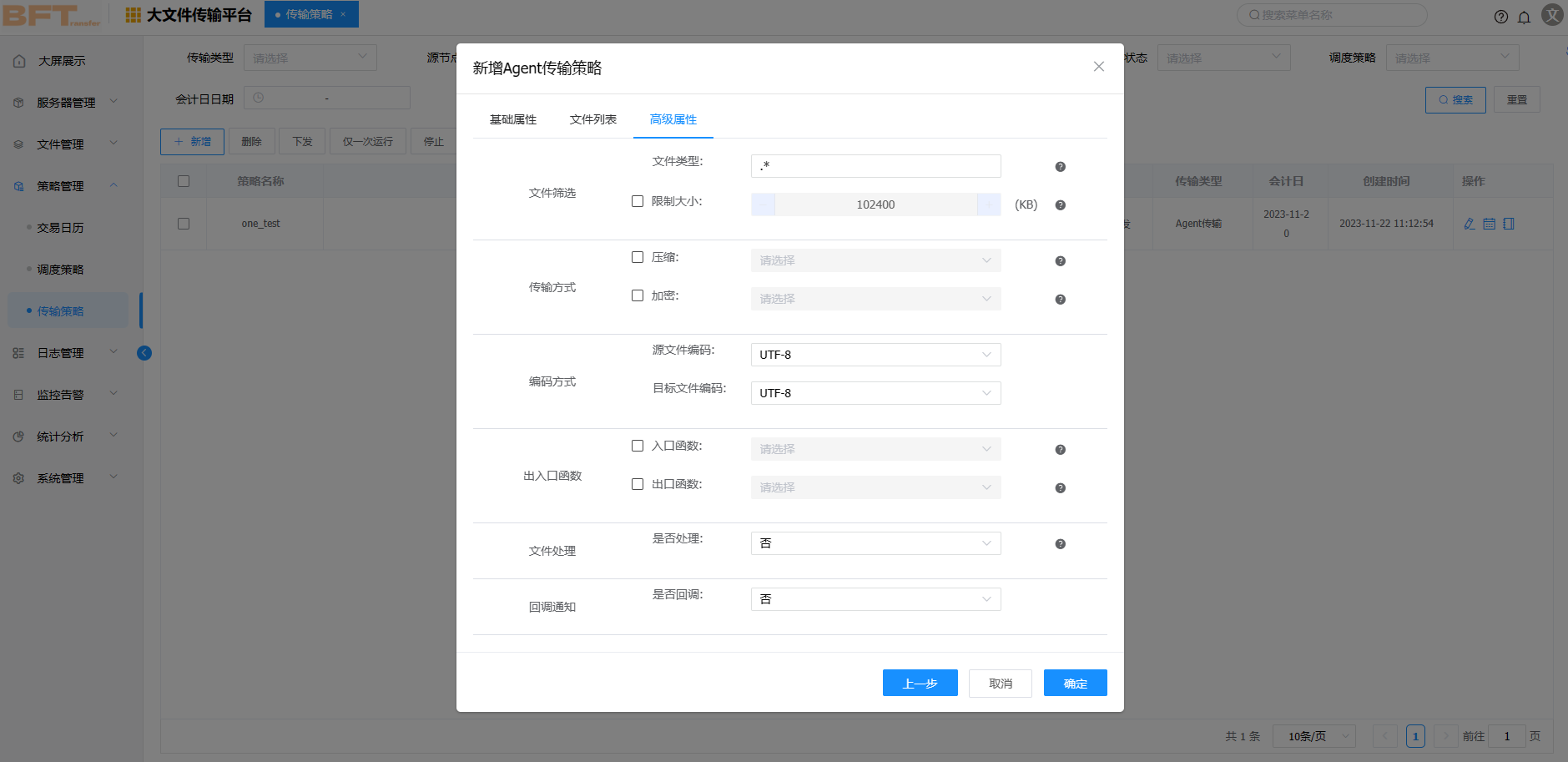 在BFT Console中点击菜单【策略管理】>【传输策略】,右侧区域显示 "传输策略" 界面。