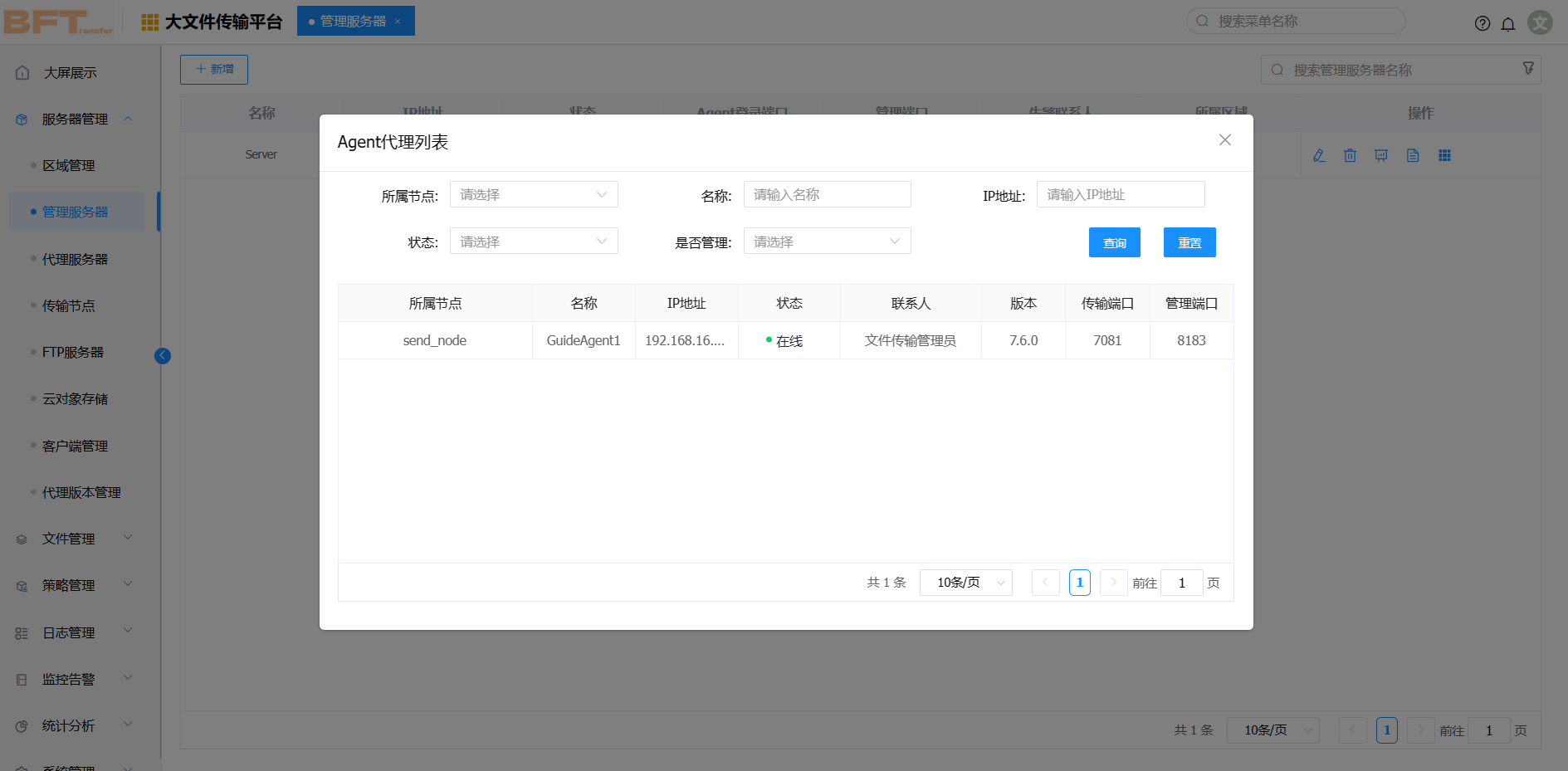 在控制管理中心进入菜单【服务器管理】>【管理服务器】,点击【托管代理节点】按钮,查看该管理节点托管的代理服务器信息。