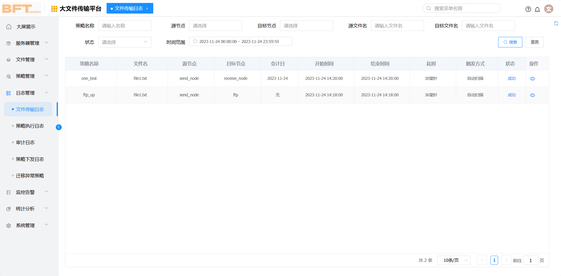 此章节介绍大文件传输平台(Primeton BFT)可通过文件传输日志,策略执行日志,告警日志查看传输策略运行结果