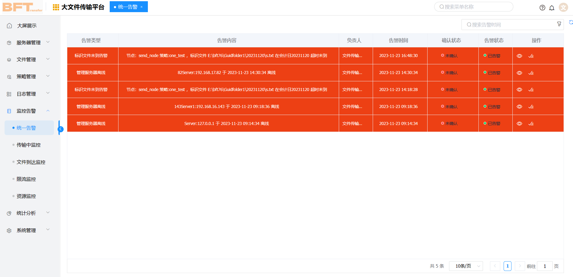 在BFT Console中点击菜单【监控告警】>【统一告警】,右侧区域显示 "统一告警" 界面。