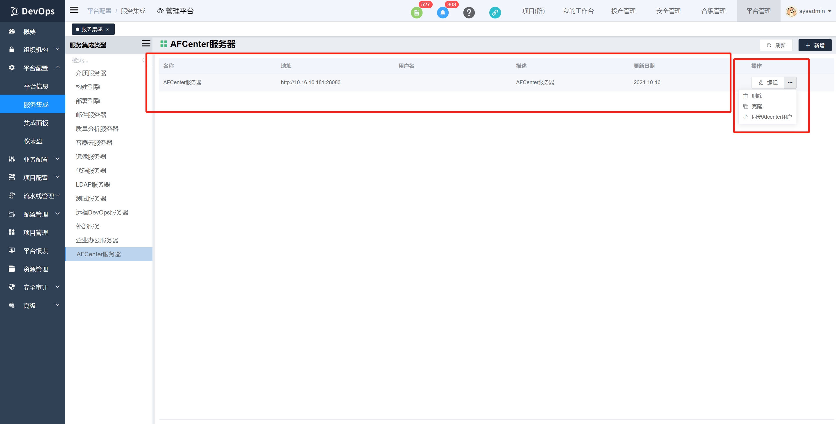 在服务集成中找到AFCenter服务器类型,点击新增按钮创建AFCenter服务器。