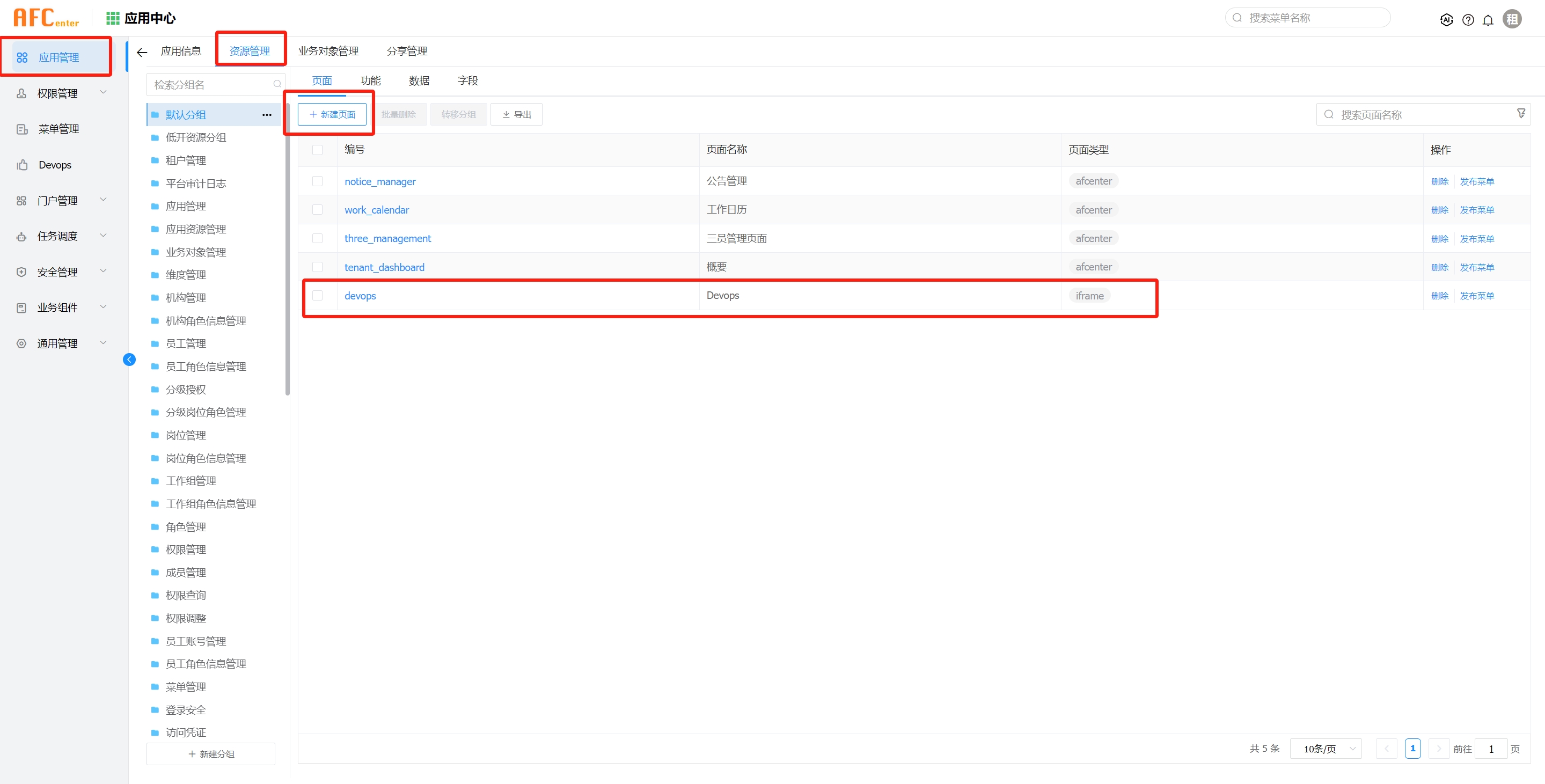 应用中心》应用管理》AFCENTER应用》资源管理》新建页面