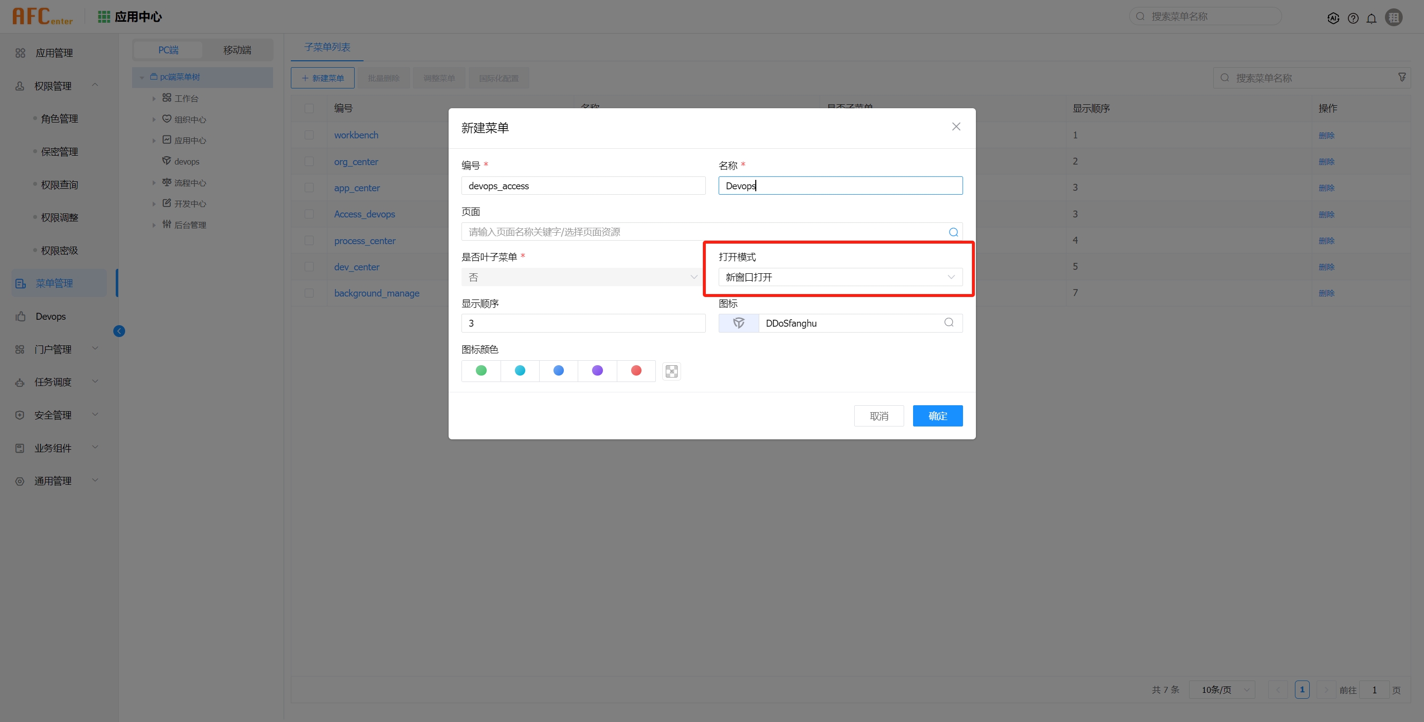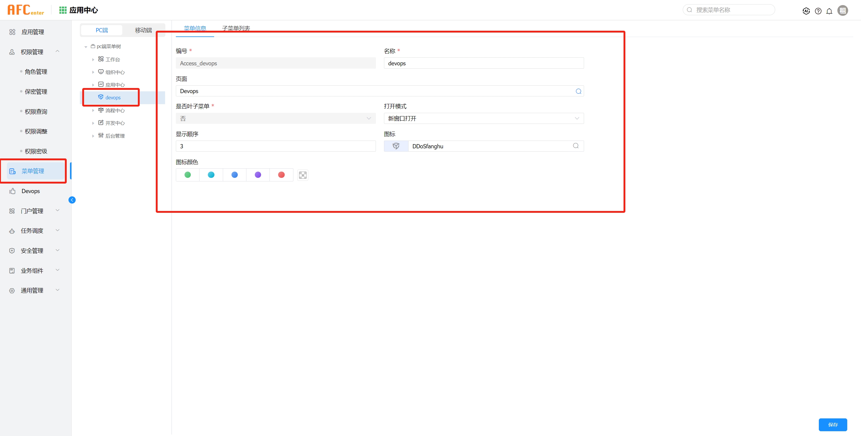 应用中心》菜单管理里》PC端》新建菜单