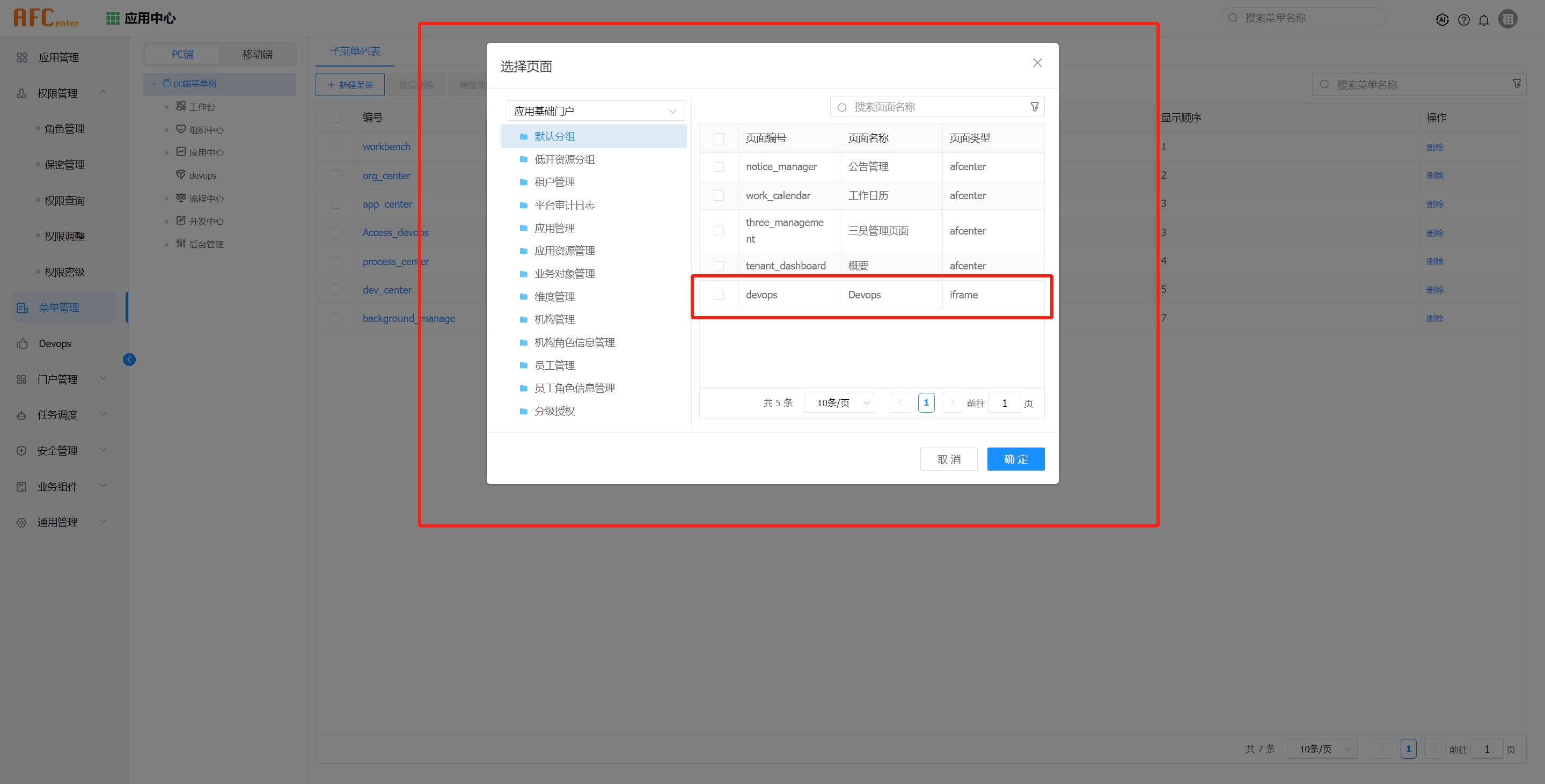 配置afcenter应用页面