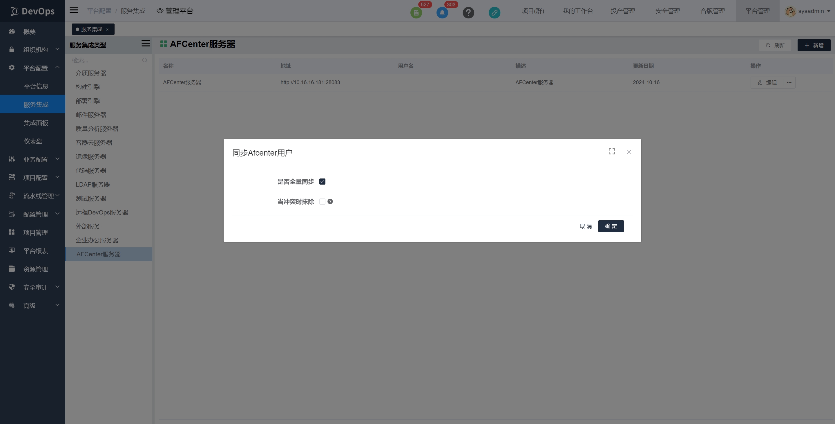 是否全量同步:选中时会保持和afcenter服务一致,devops里有不在afcenter服务中的组织机构和人员时会被删除。不选中则会保留devops原有组织机构和人员。