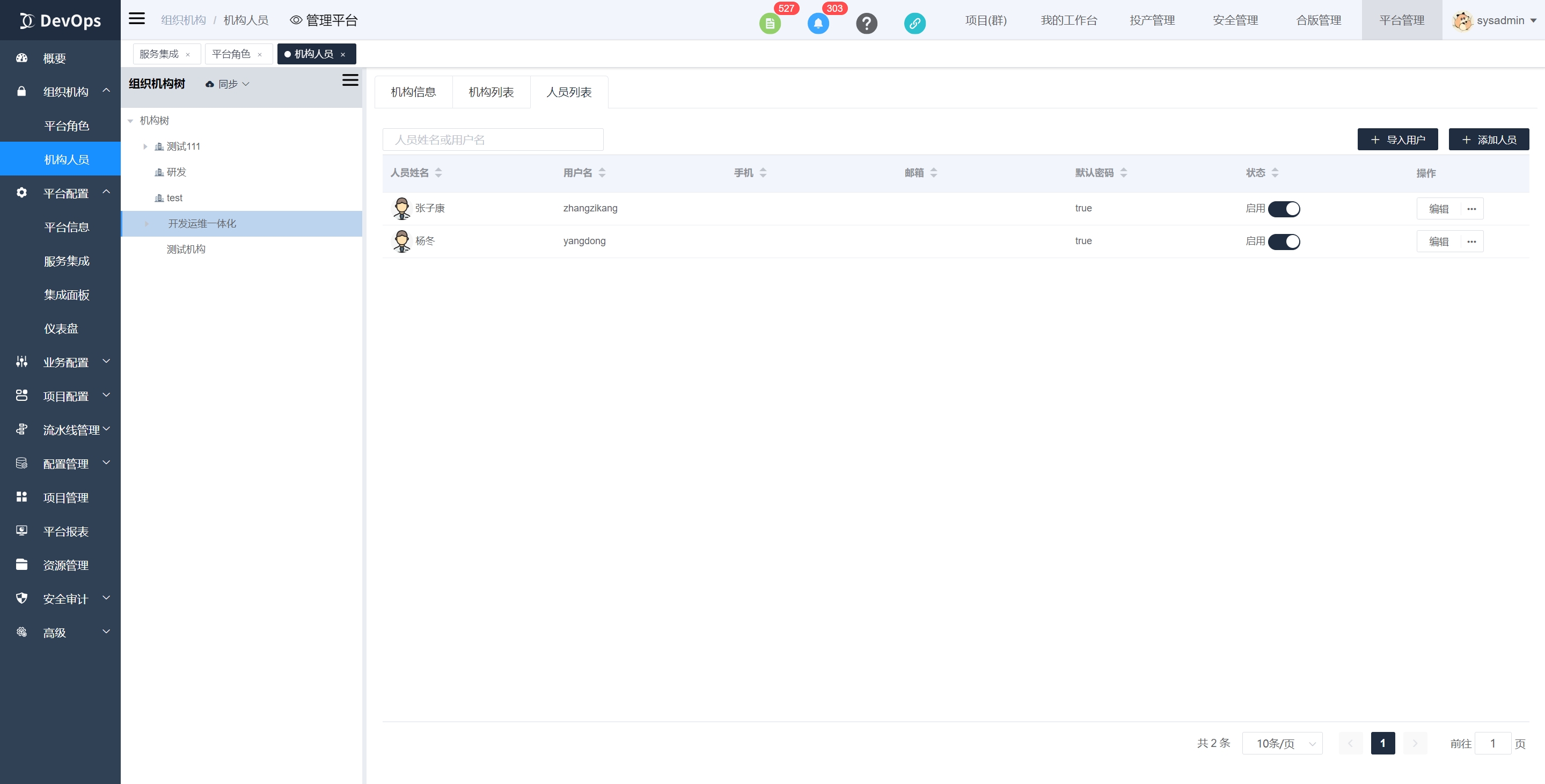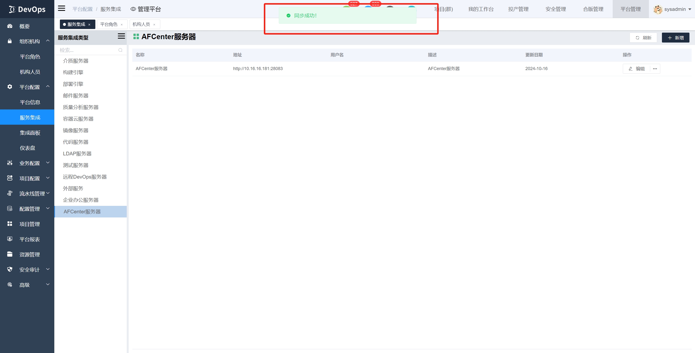 2、afcenter同步的用户通常不包括afcenter用户中的sysadmin[系统管理员]和admin[租户管理员]。但是在devops登录时仍然可以用这两个用户账户密码登录,他们会自行映射为devops的sysadmin[系统管理员]。