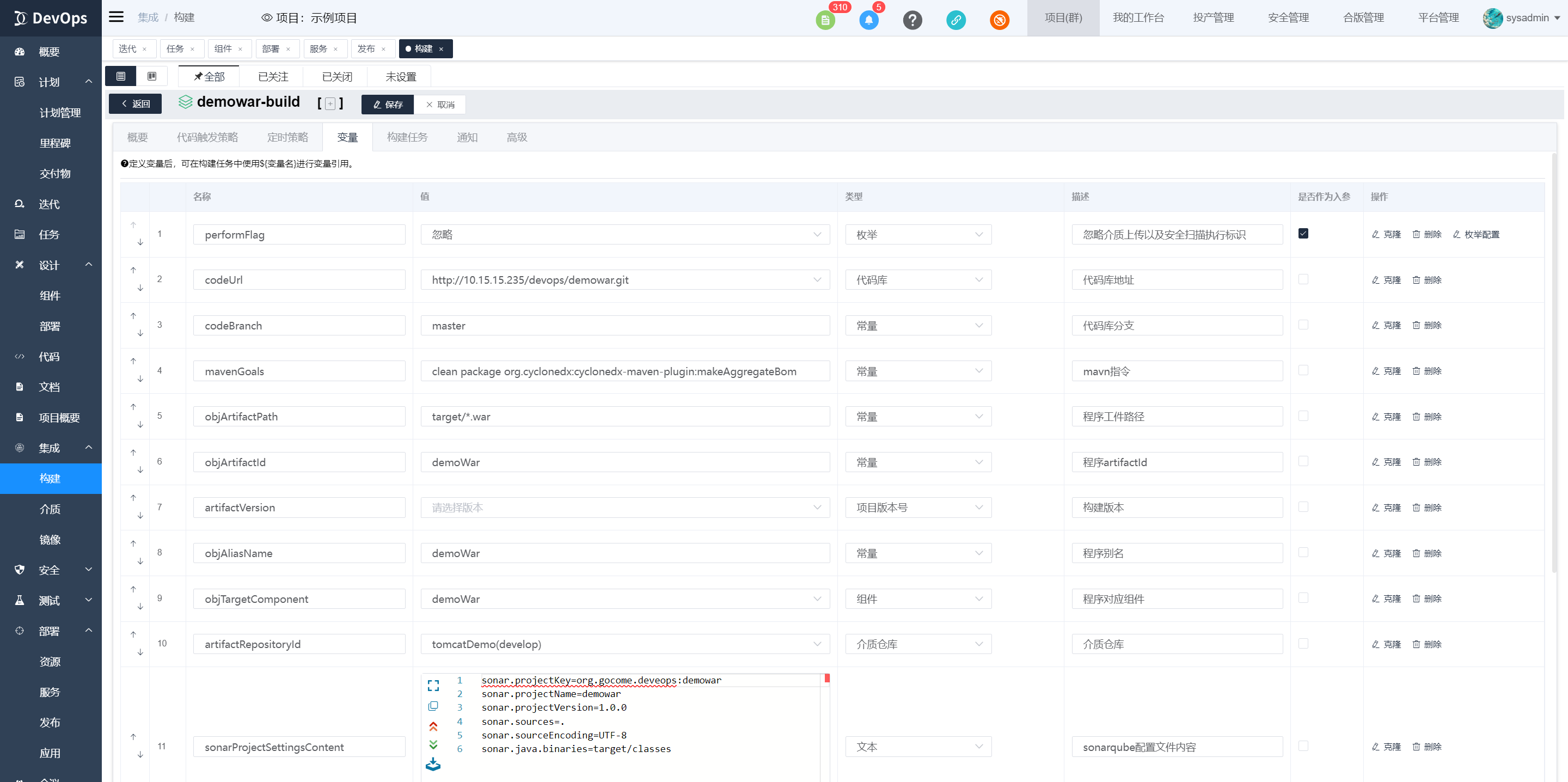 以demojar构建定义为例,此处展示了相关的所有变量,可以直观的了解需要人工确认的参数。
