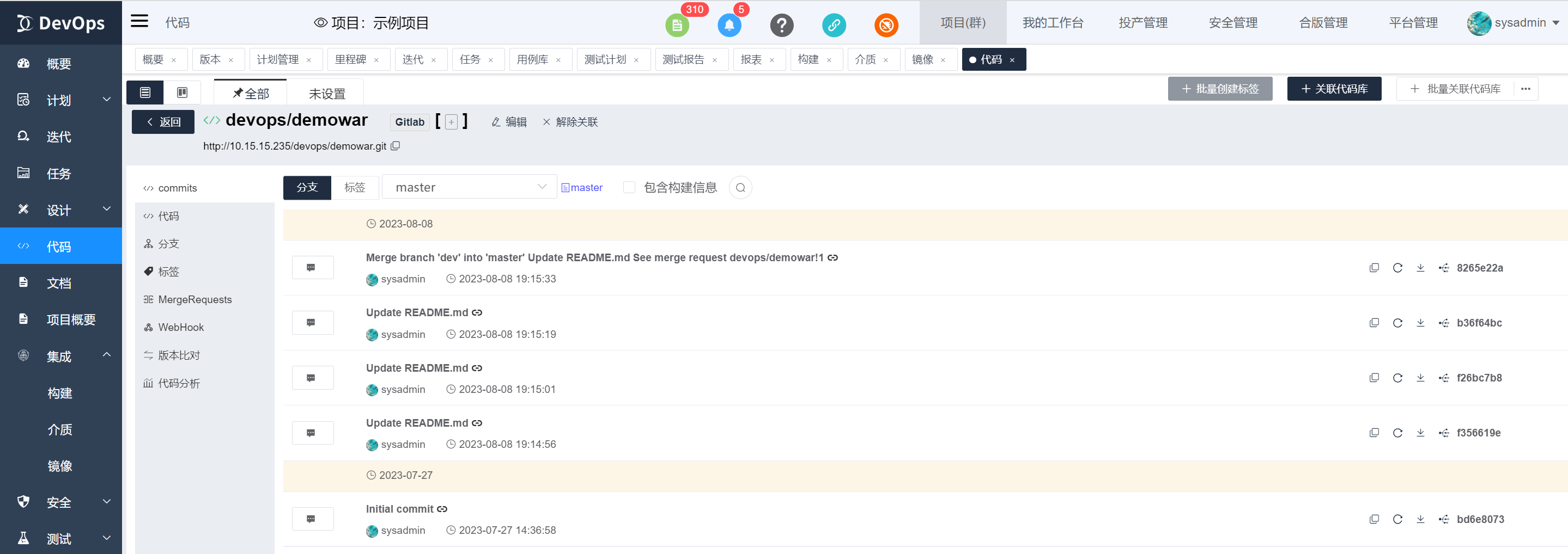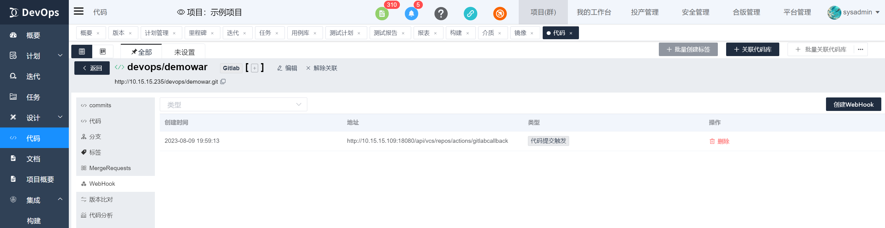 填写了代码库信息后会自动关联代码库到该项目,并创建代码提交触发的webhook回调。