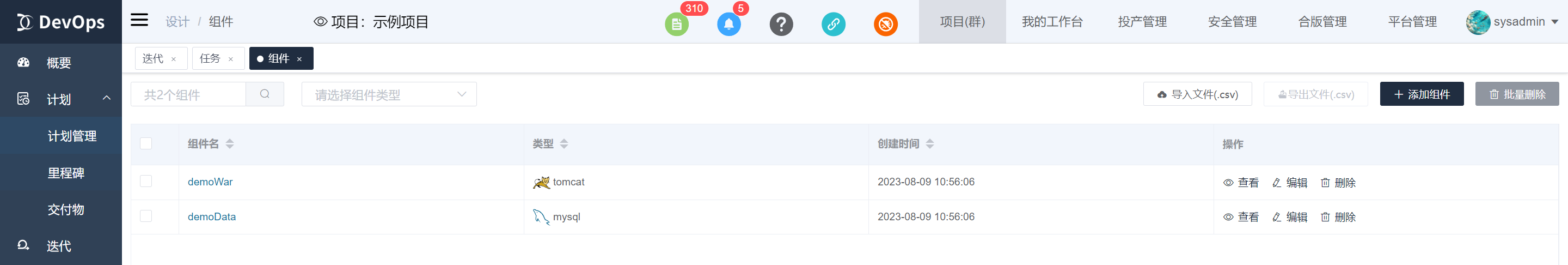 创建demoWar名称的tomcat类型程序组件和demoData名称的mysql类型的数据组件