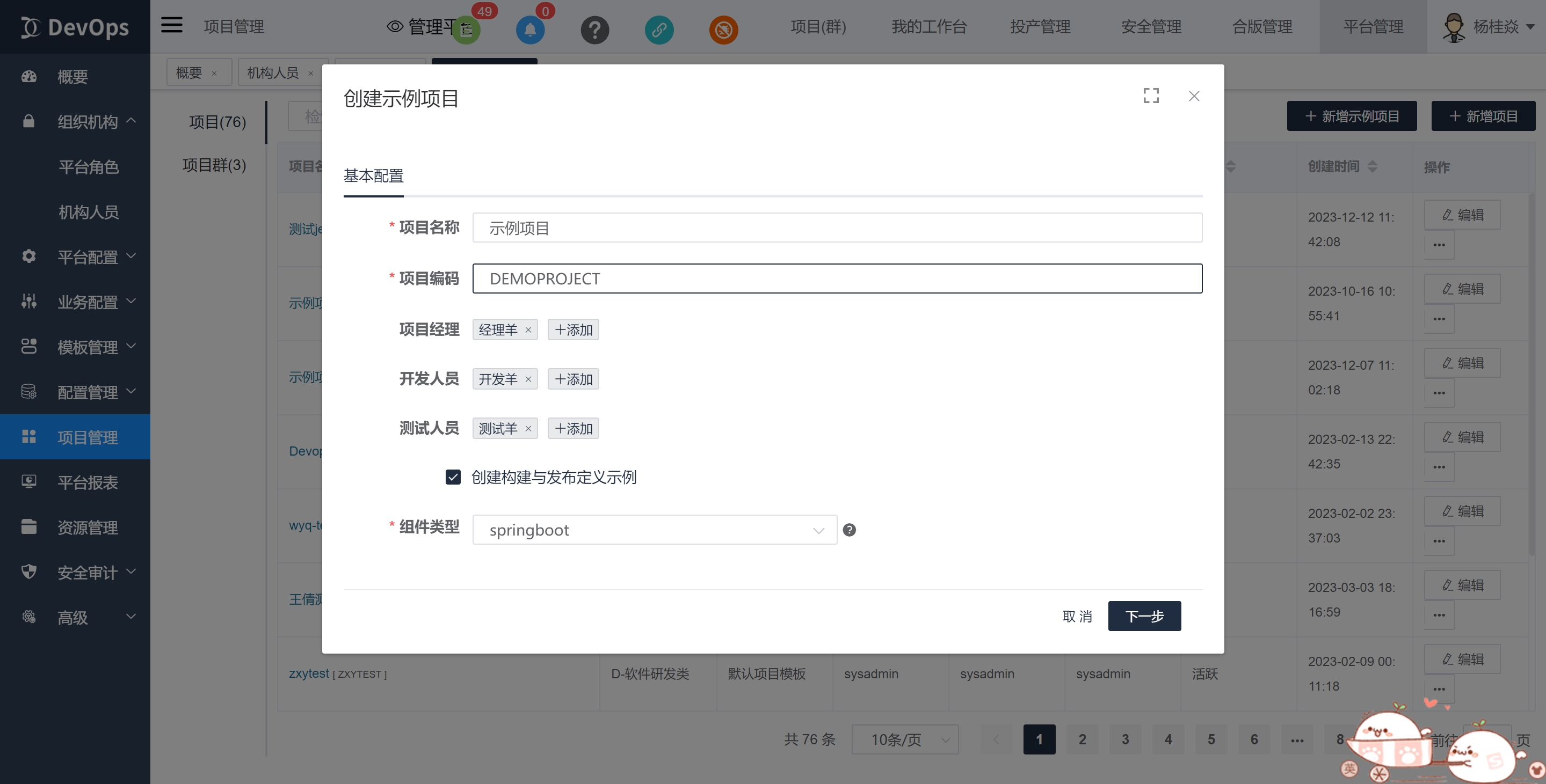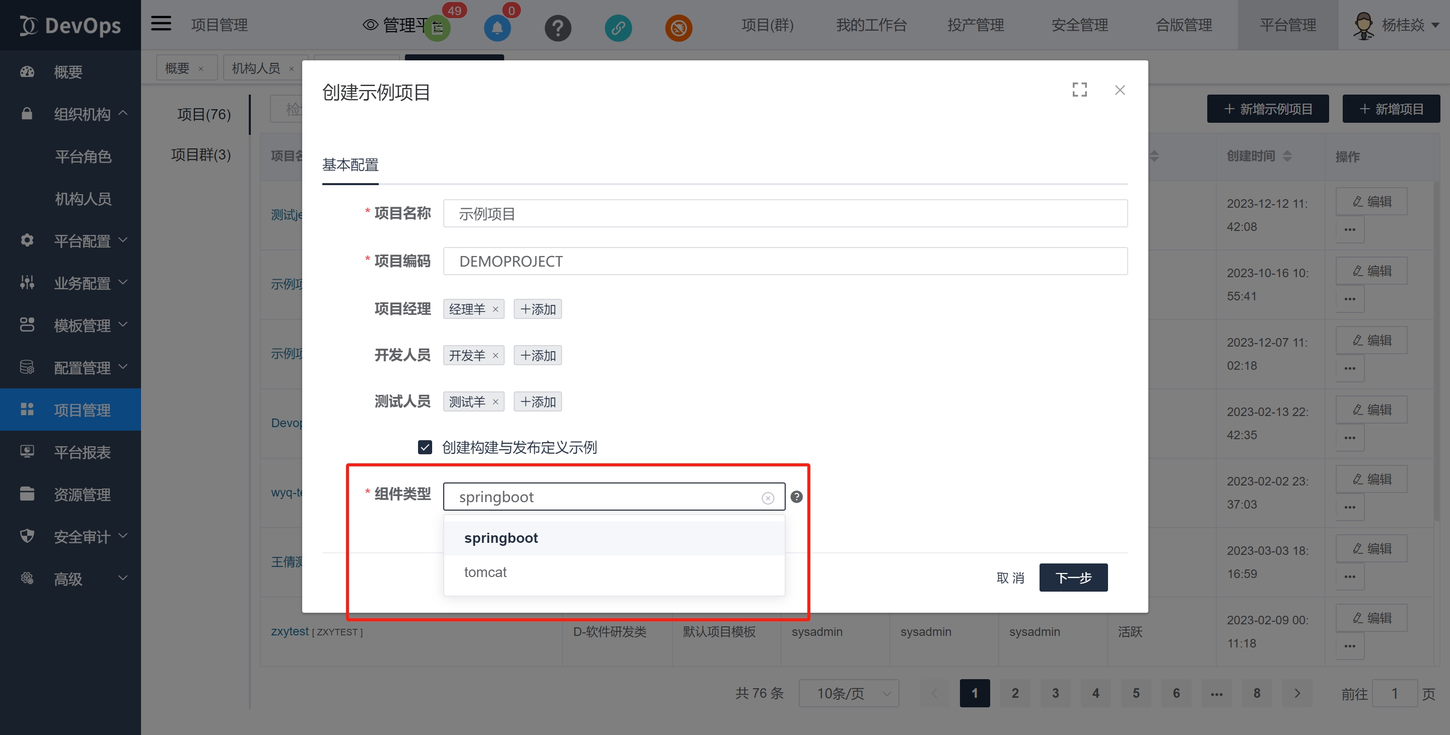 添加开发人员-从平台成员中选择,至少选一人,添加的人员默认为开发人员角色