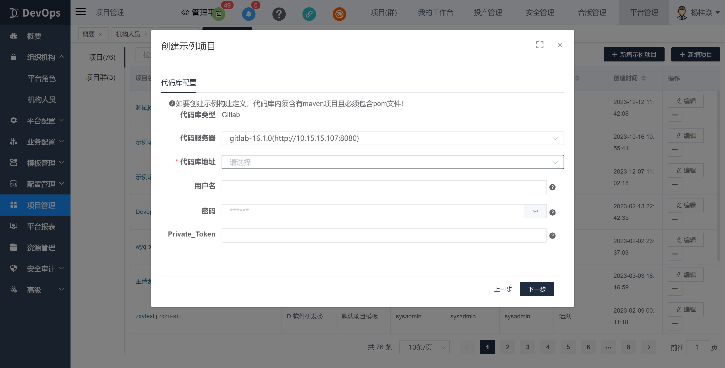填写代码库信息-填写了代码库信息后会自动关联代码库到该项目,并创建代码提交触发的webhook回调。