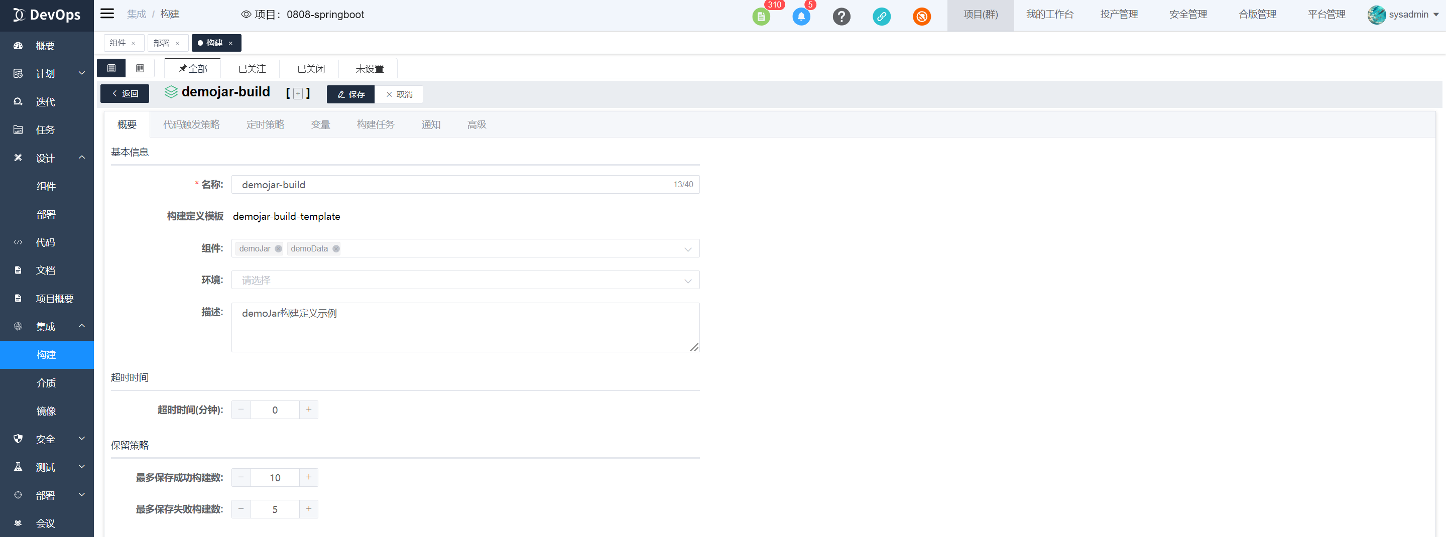 创建名称为demojar-build的构建定义并关联了对应组件,详细内容参考示例构建配置部分。