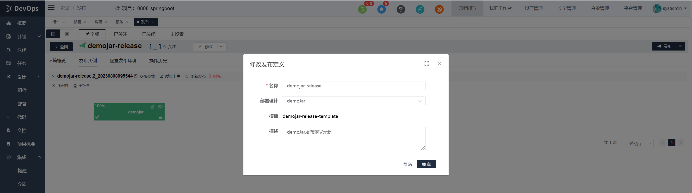 创建名称为demojar-release的构建定义并关联了对应部署设计,详细内容参考示例发布配置部分。