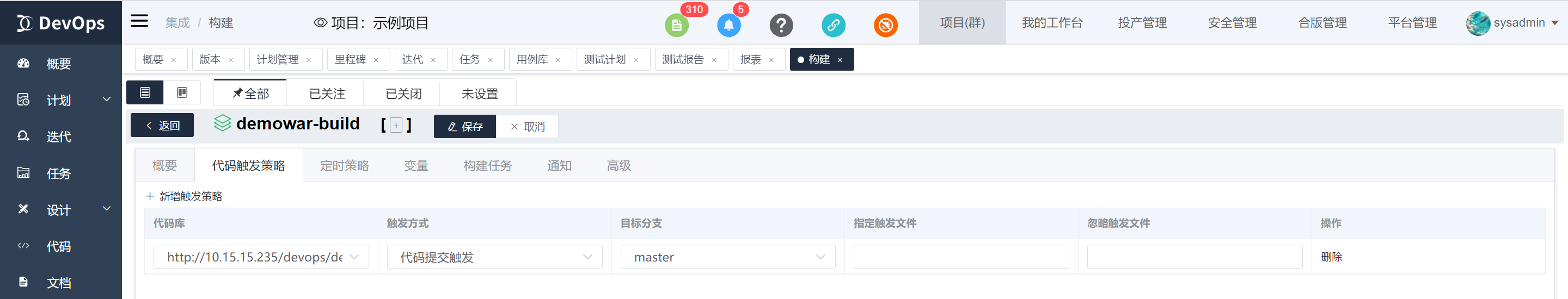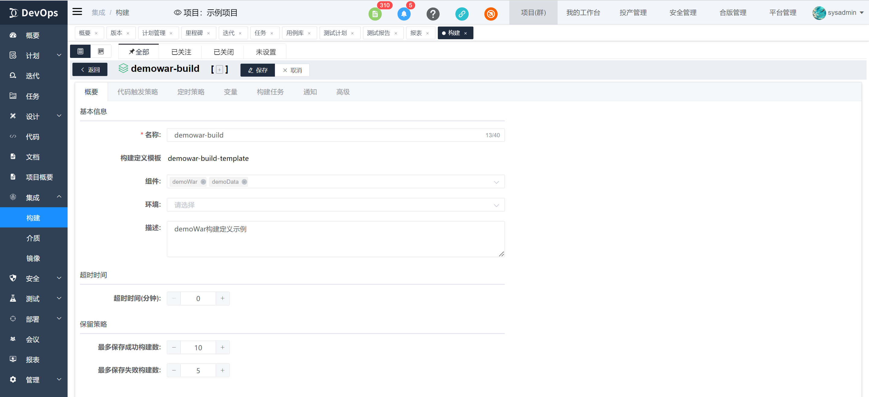 创建名称为demowar-build的构建定义并关联了对应组件,详细内容参考示例构建配置部分。