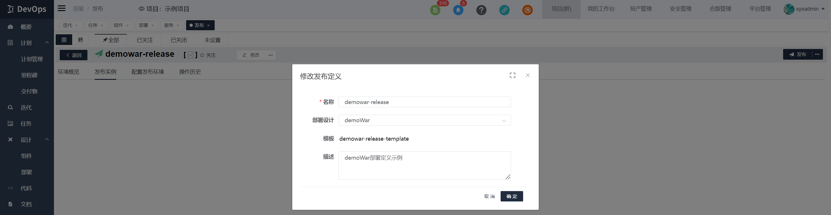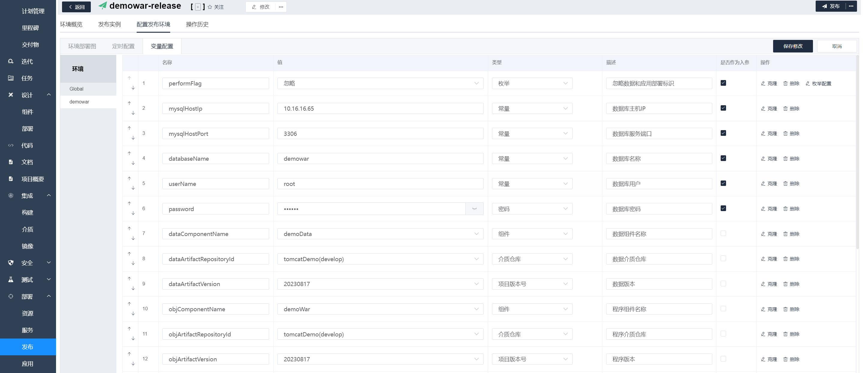 创建名称为demowar-release的发布定义并关联了对应部署设计,详细内容参考示例发布配置部分。