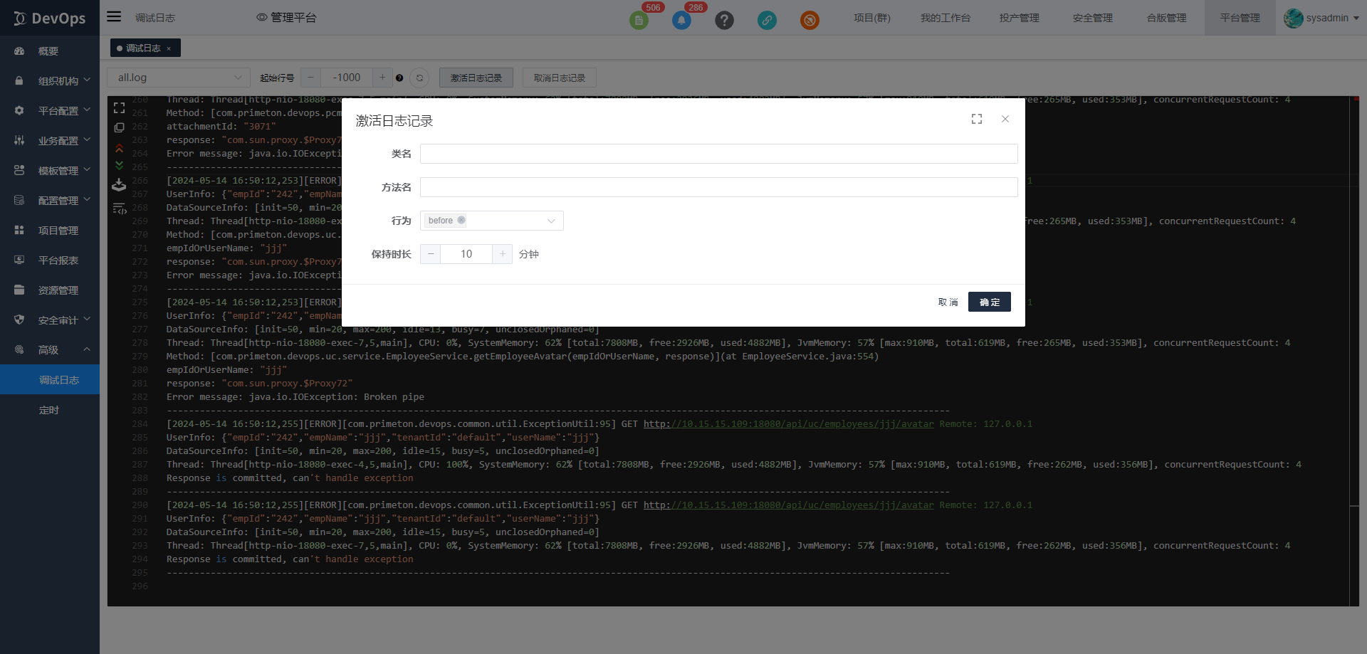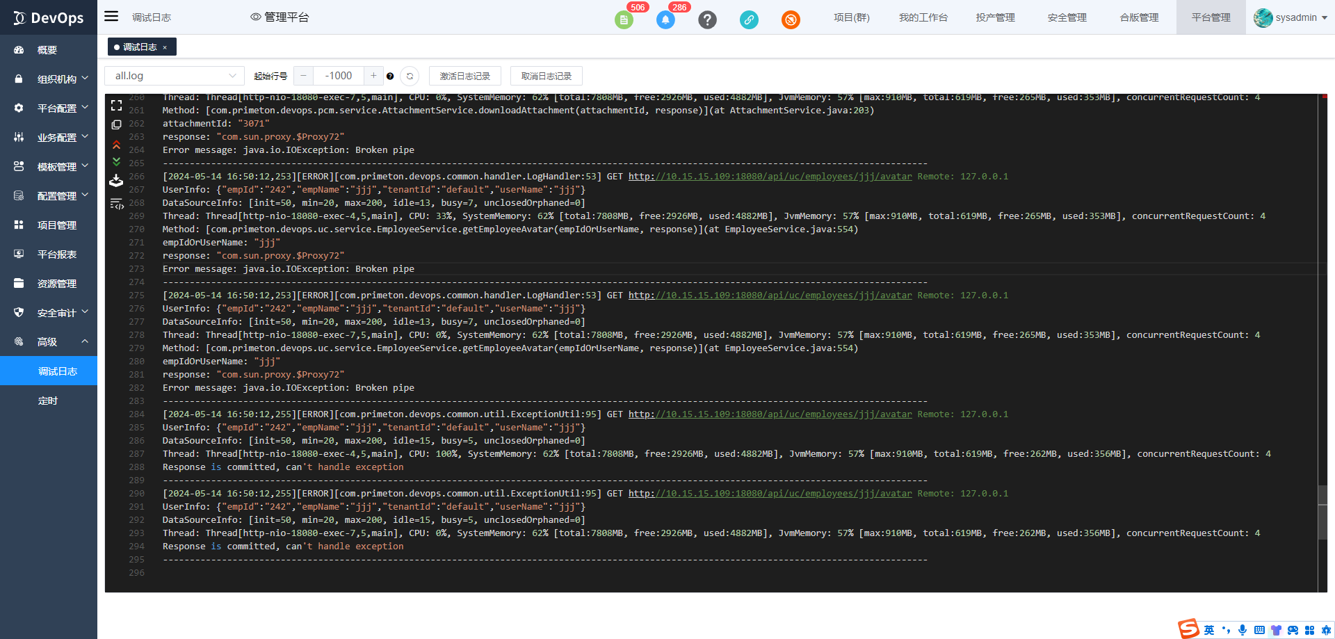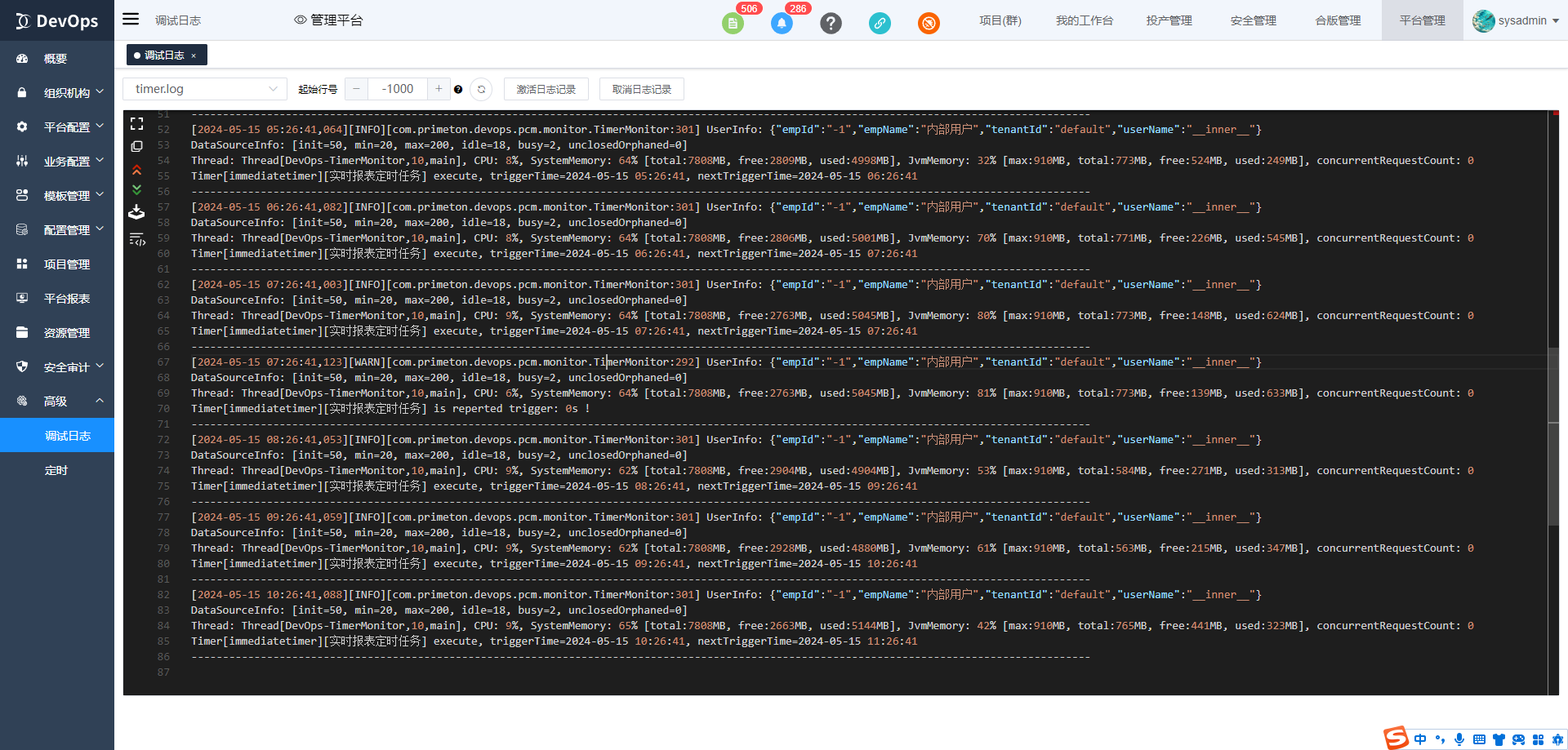 调试模式下可以浏览平台调试日志。