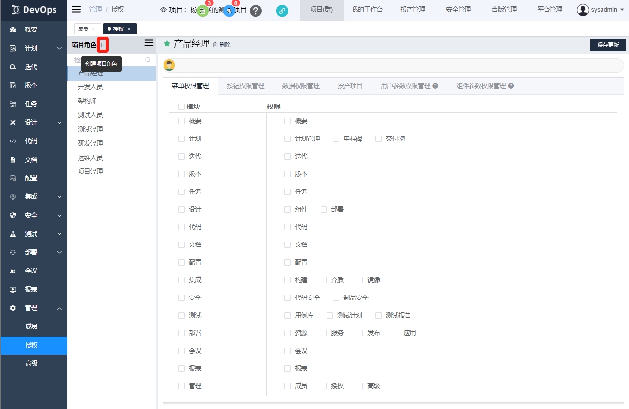 项目角色通常通过角色组模版来初始化基础角色,特定项目角色可以等项目创建完成后在项目内》管理》授权添加新的角色和对应权限。