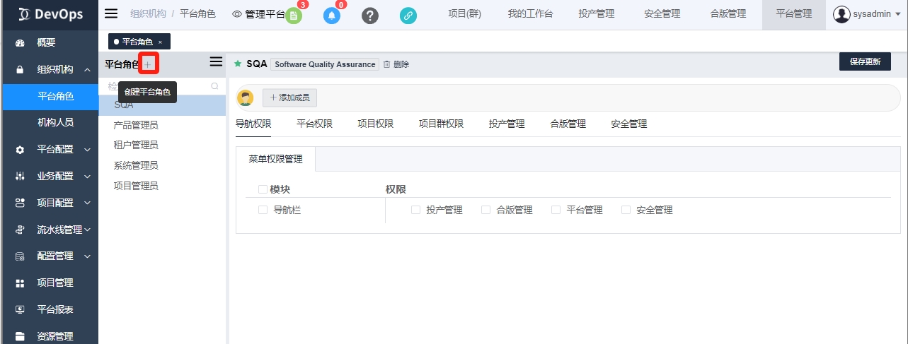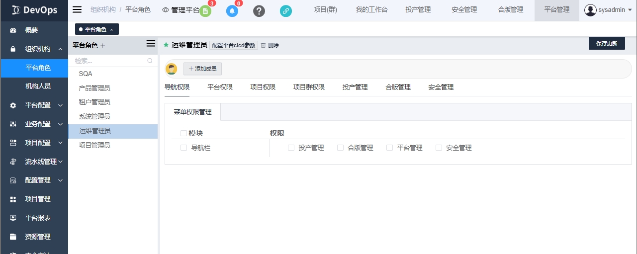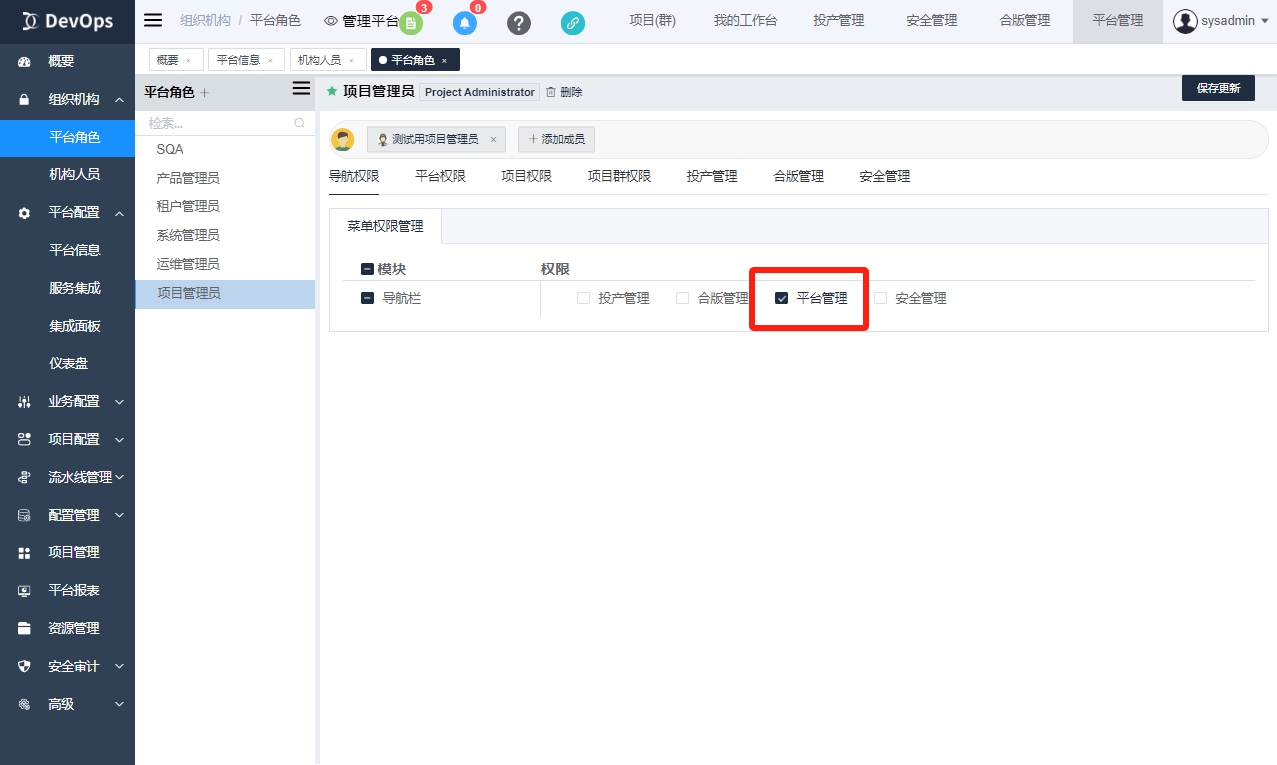 注意 涉及平台管理的权限的角色,一定要先配置导航权限中导航栏内的平台管理菜单权限!