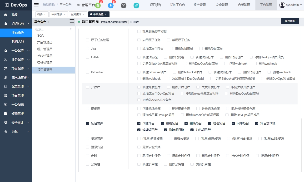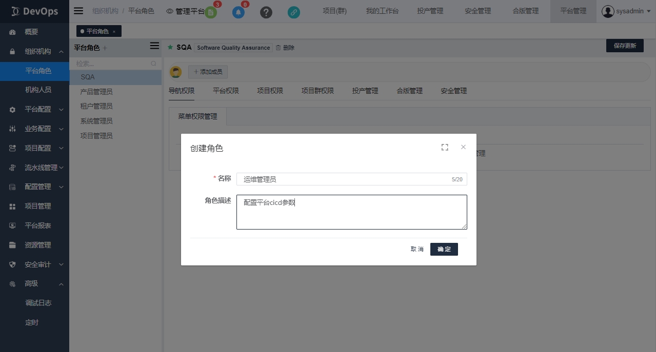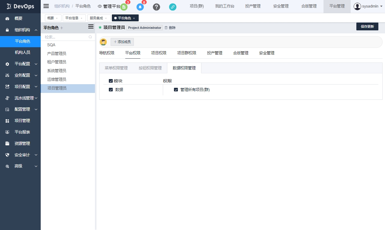 平台角色通常配置为各种管理员角色如系统管理员,项目管理员等。