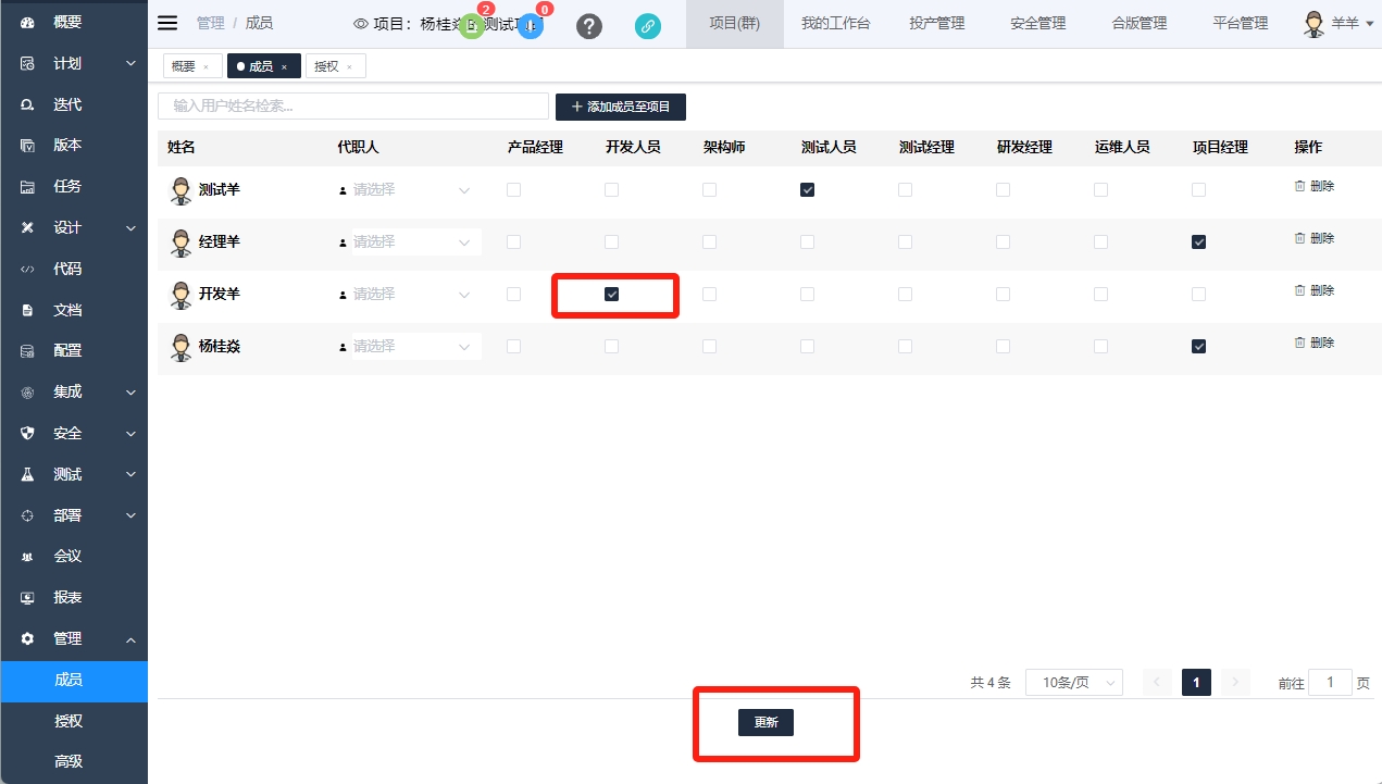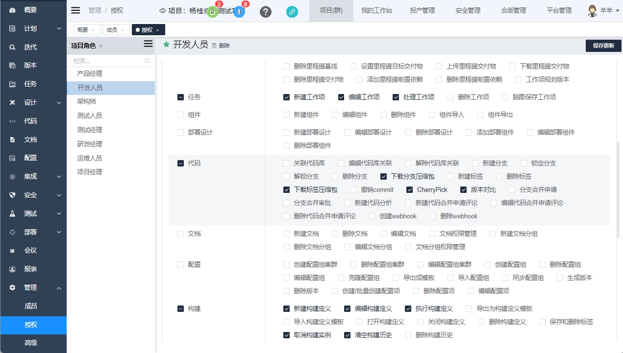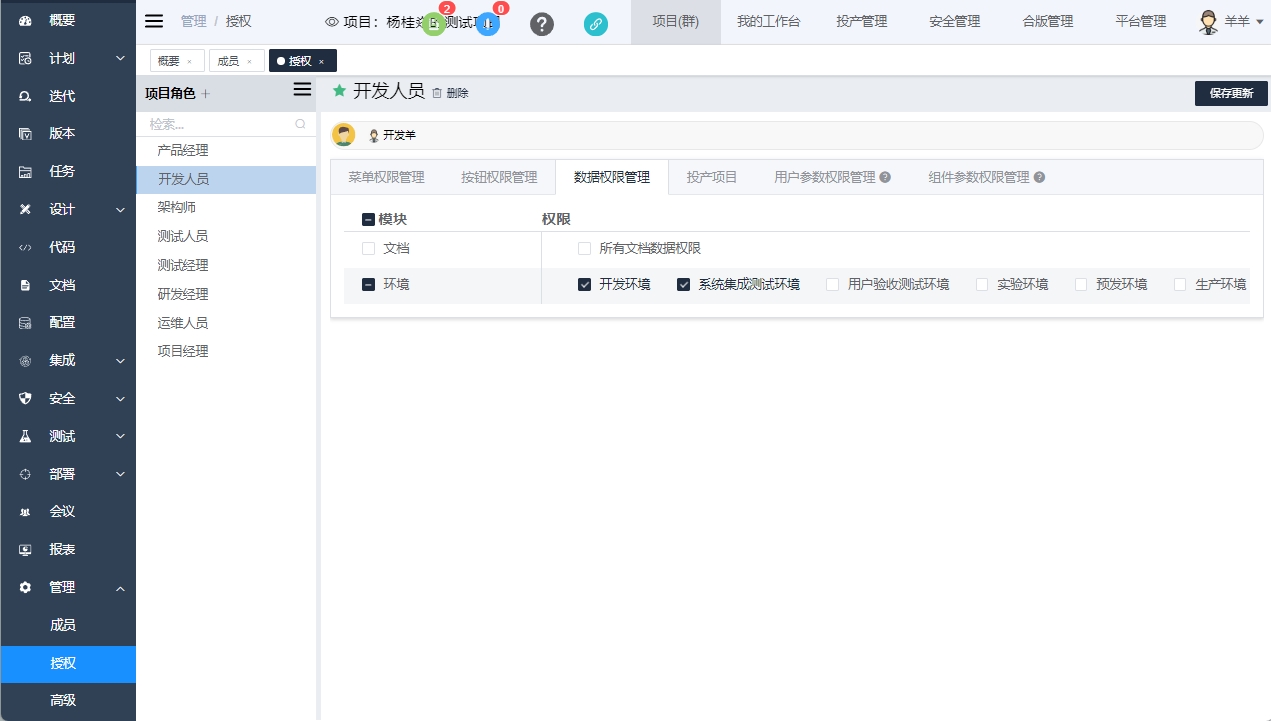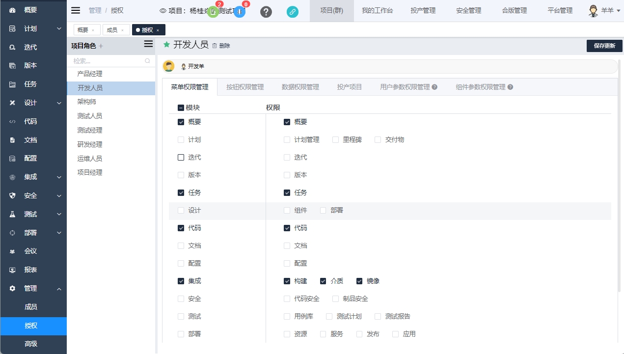 人员拥有的权限为其拥有的平台角色权限和项目角色权限的合集。