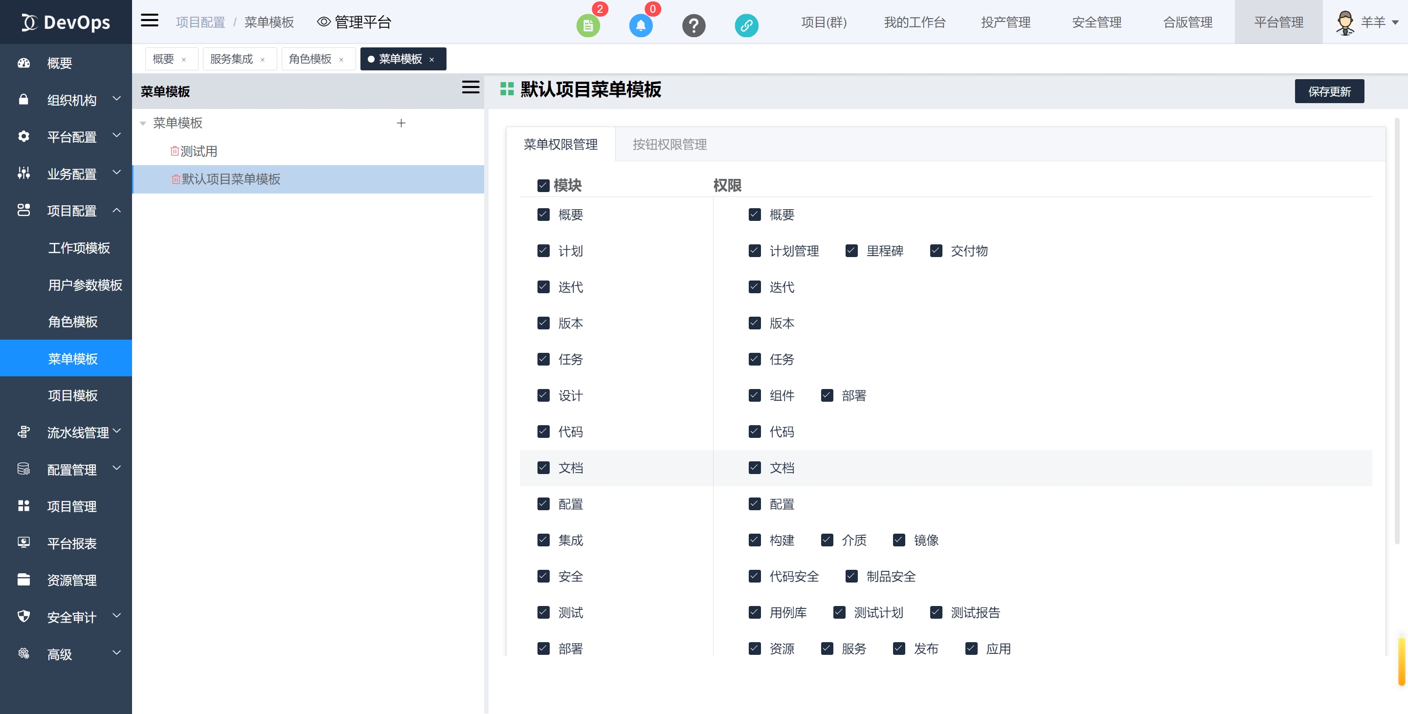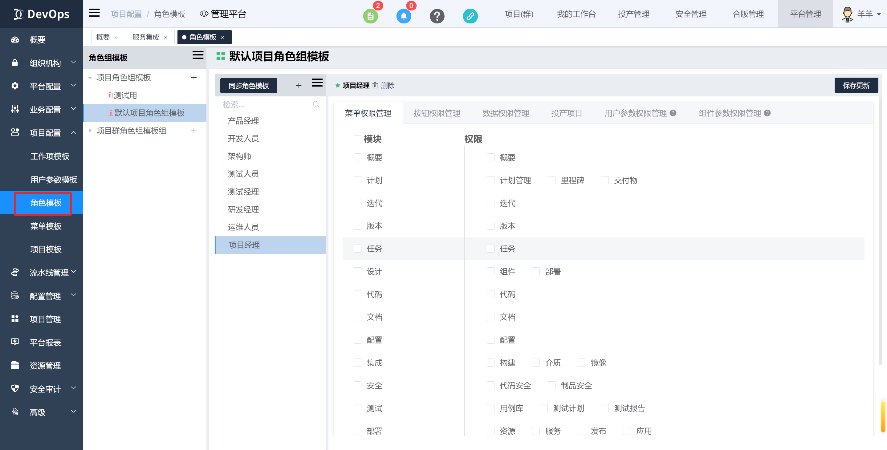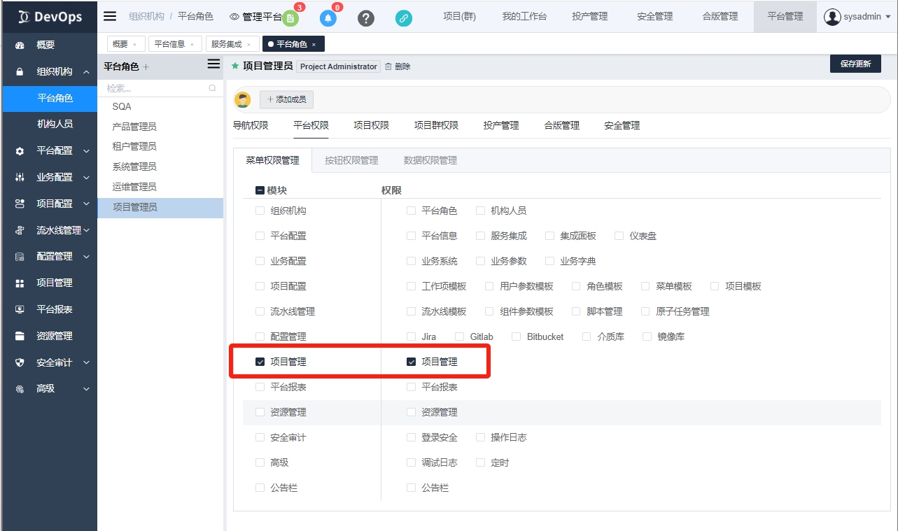 2、配置导航权限、平台权限,菜单权限项目管理模块和项目管理权限