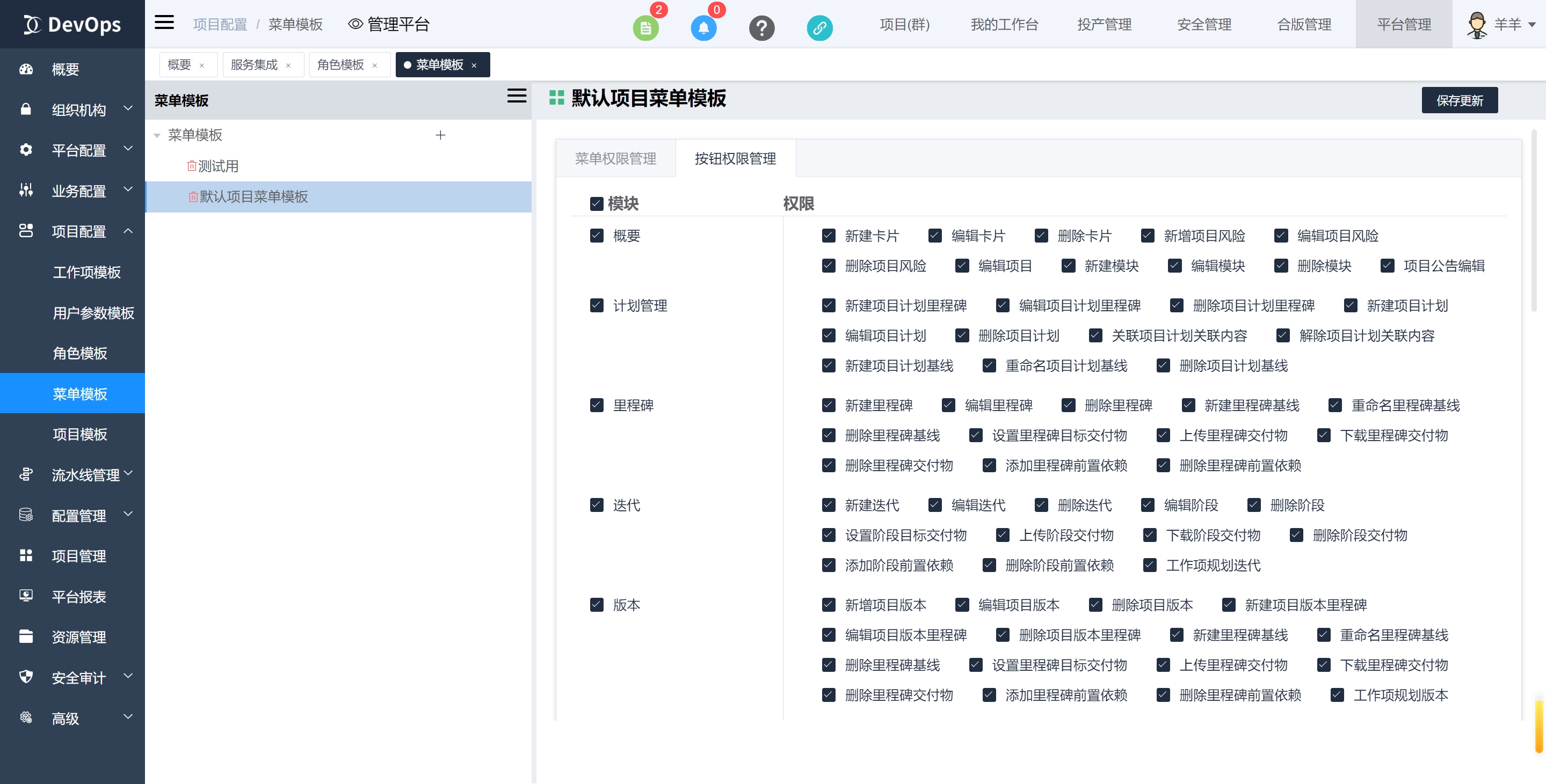菜单模版:项目内的最大菜单可见范围,未勾选的菜单即使人员有对应菜单权限也不可见该菜单。