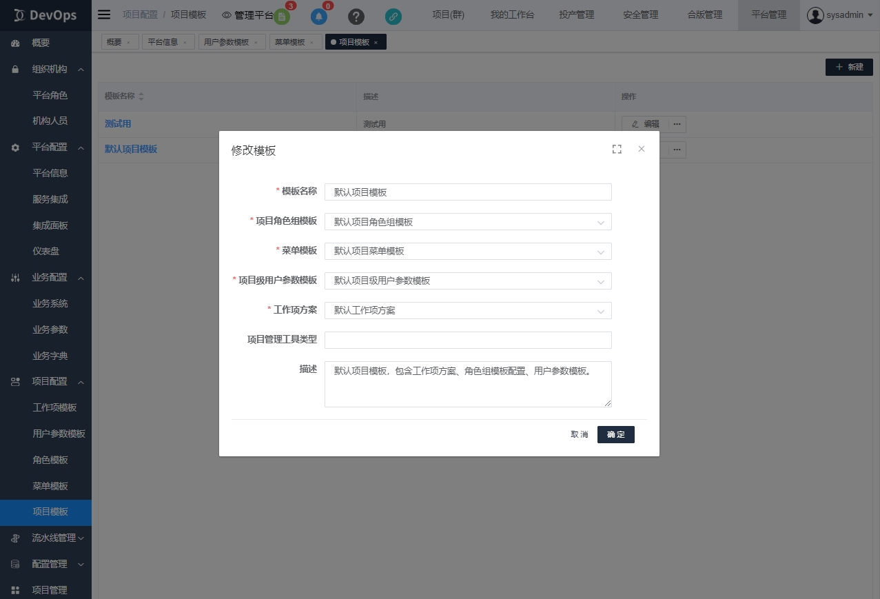 项目模版可以选择合适的角色组模版和菜单模版,保证所有同类项目结构的一致性。