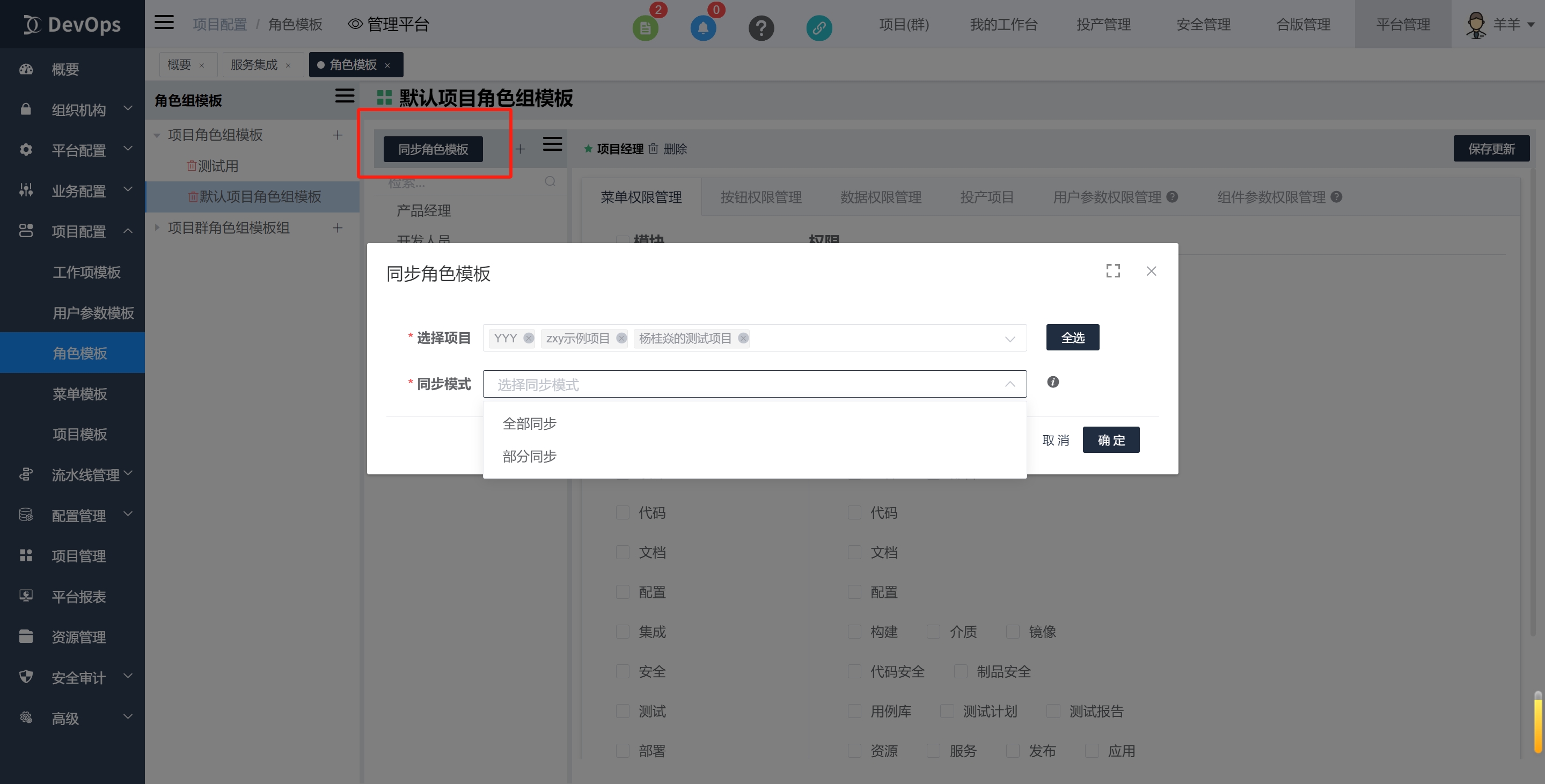 部分同步:所有选择项目中的相同角色名的角色与变更后的角色权限一致,变更后新增的角色添加到项目,剩下的保留项目内特有的角色。