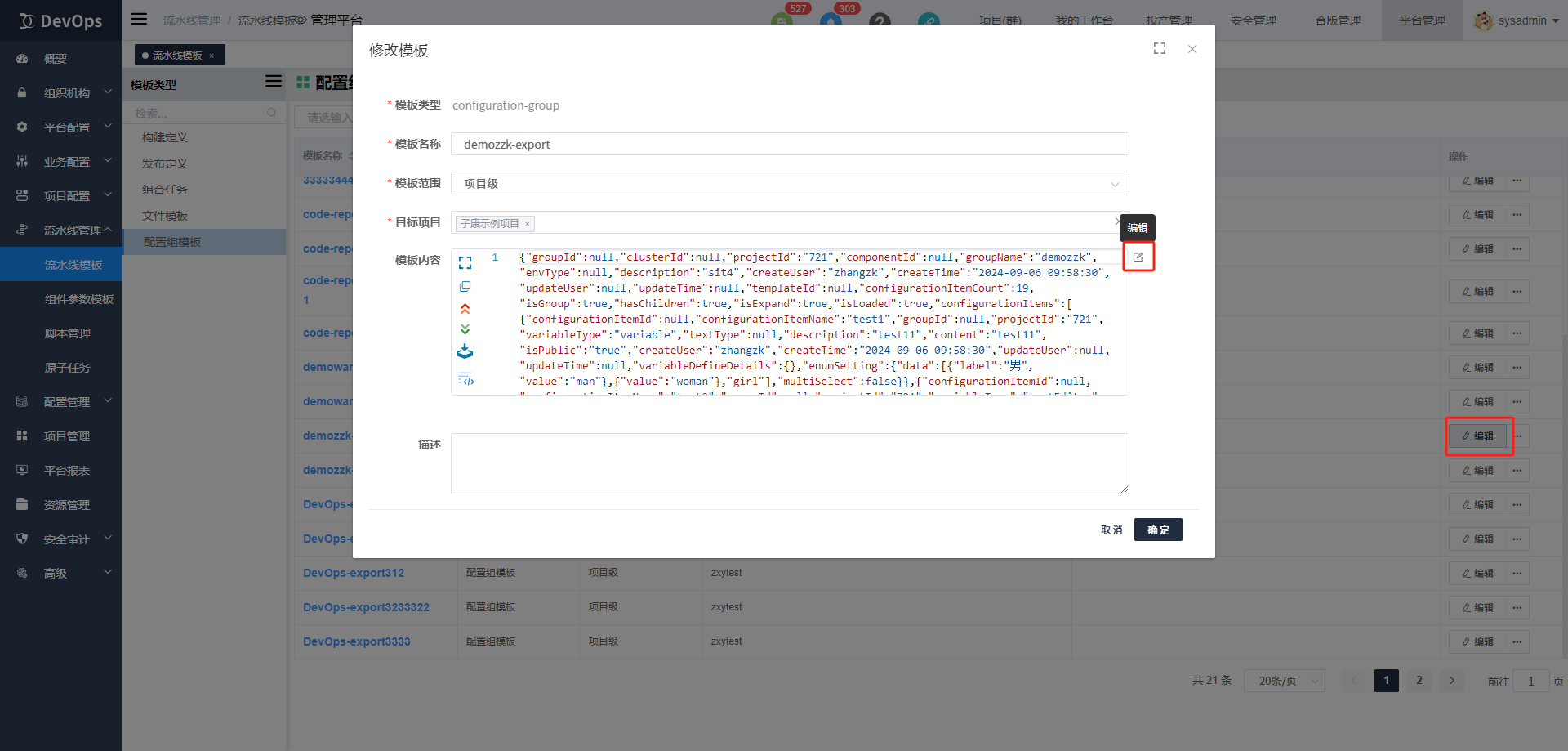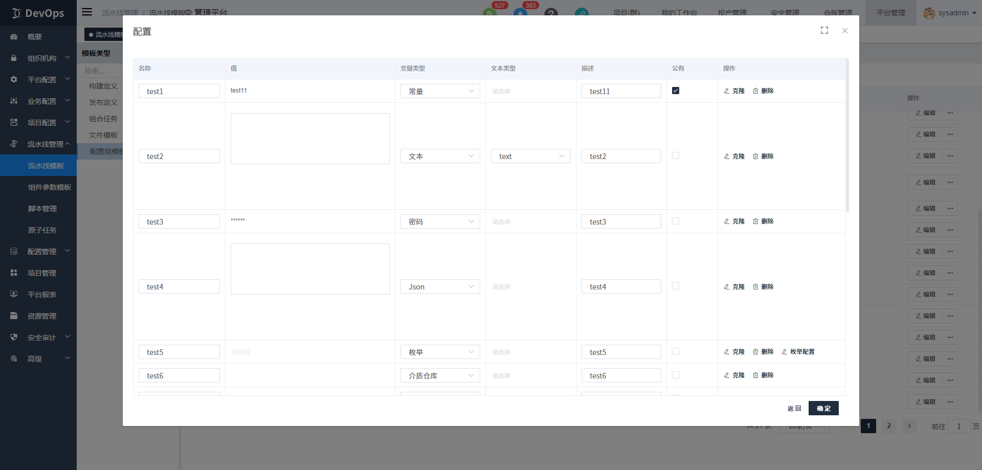 说明: 1.项目级模板转平台级模板时,会置空模板历史记录。 2.项目级模板转平台级模板时,会置空所有变量值。 3.模板编辑不允许对配置项的值赋值。