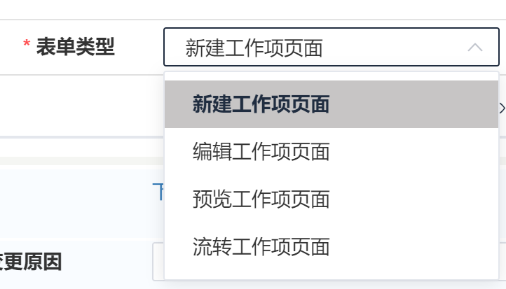表单类型包括新建、编辑、预览和流转工作项页面,选择特定的类型将关系到后续选择范围,比如工作项方案配置时新建页面只能选择新建表单类型的页面。