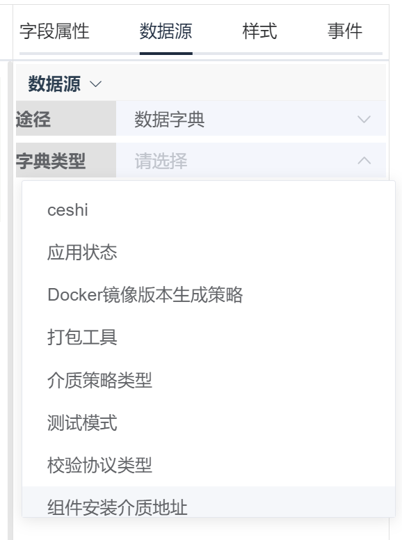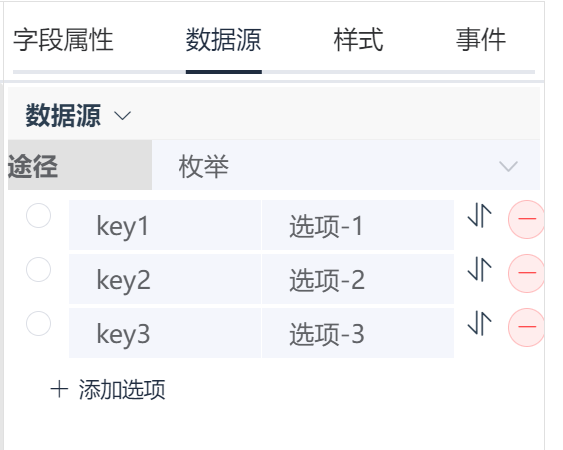 数据源包括三种类型:枚举,数据字典和后台服务枚举为自定义的键值对,前一列为key值,会赋值到标签的字段属性中,后一列为下拉框显示内容