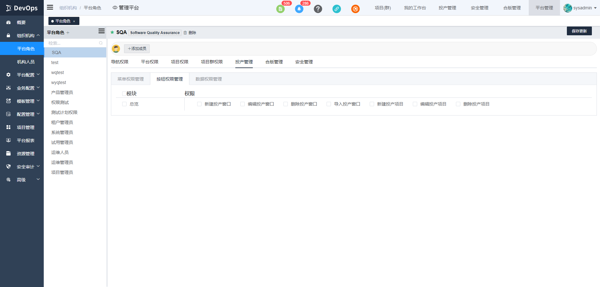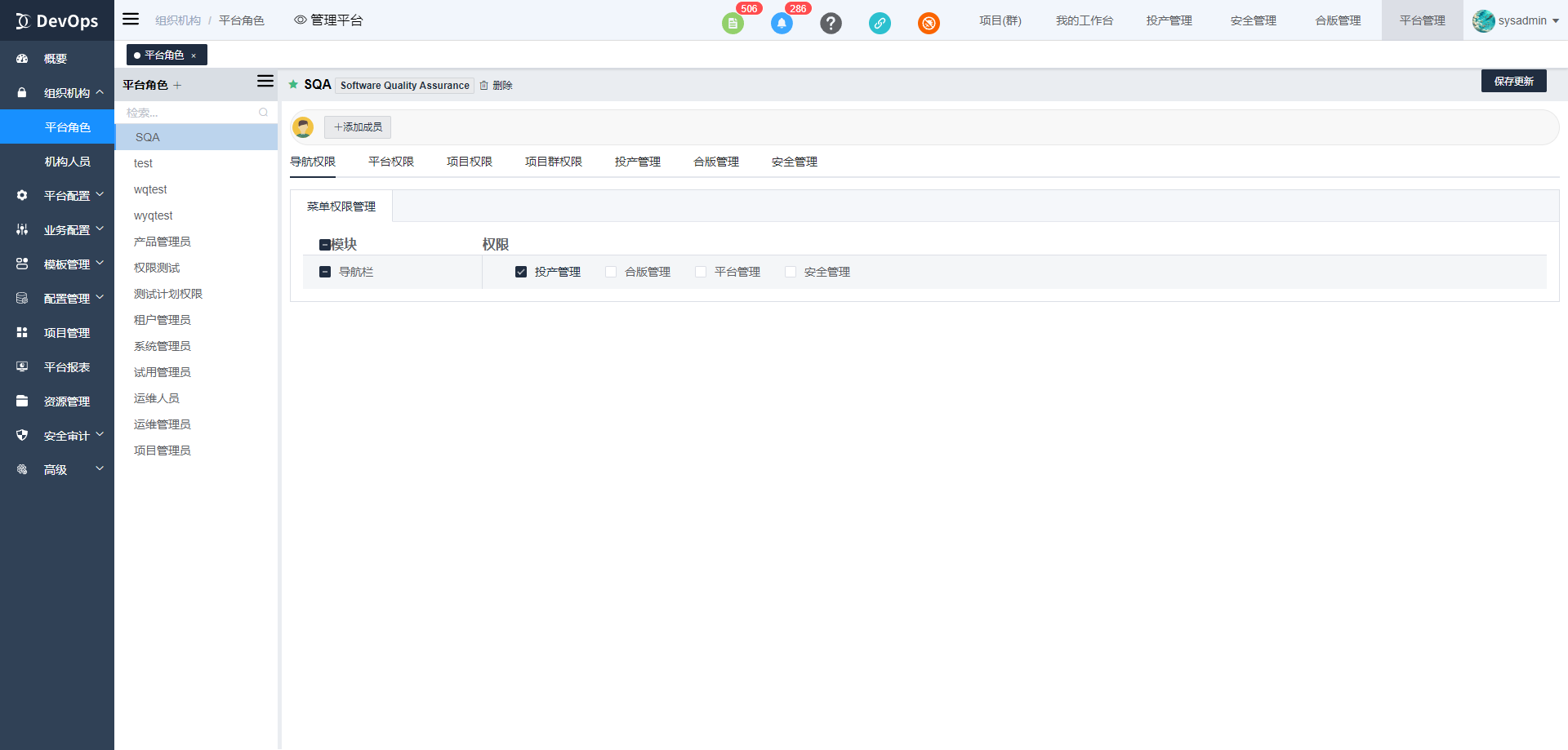 通过平台管理-组织机构-平台角色-导航权限中的投产管理权限控制页面展示。