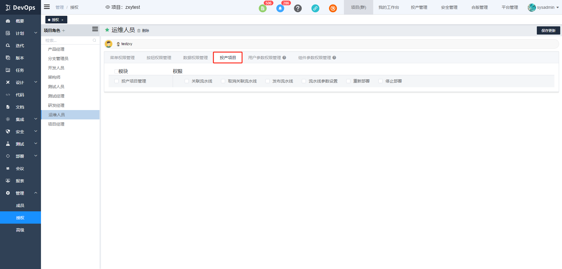 在项目级的角色权限配置页面可以找到投产项目相关权限,如配置项目级的投产项目权限可以控制如项目运维专员角色专门负责本项目的投产相关操作。