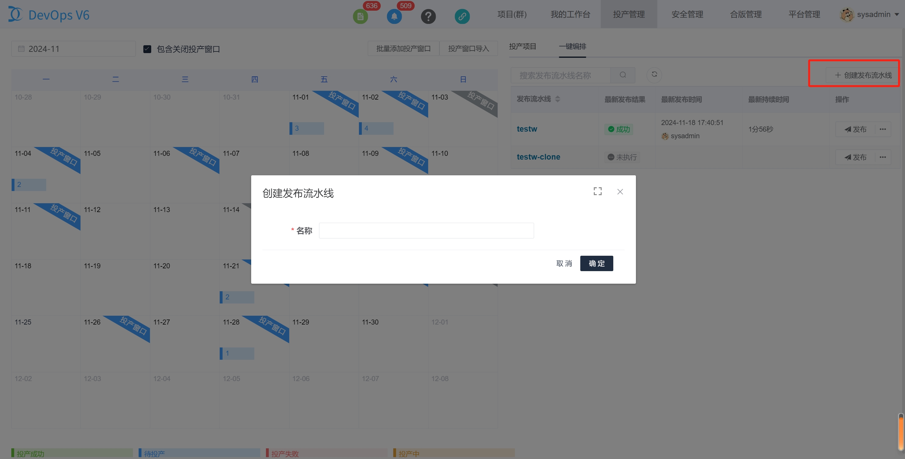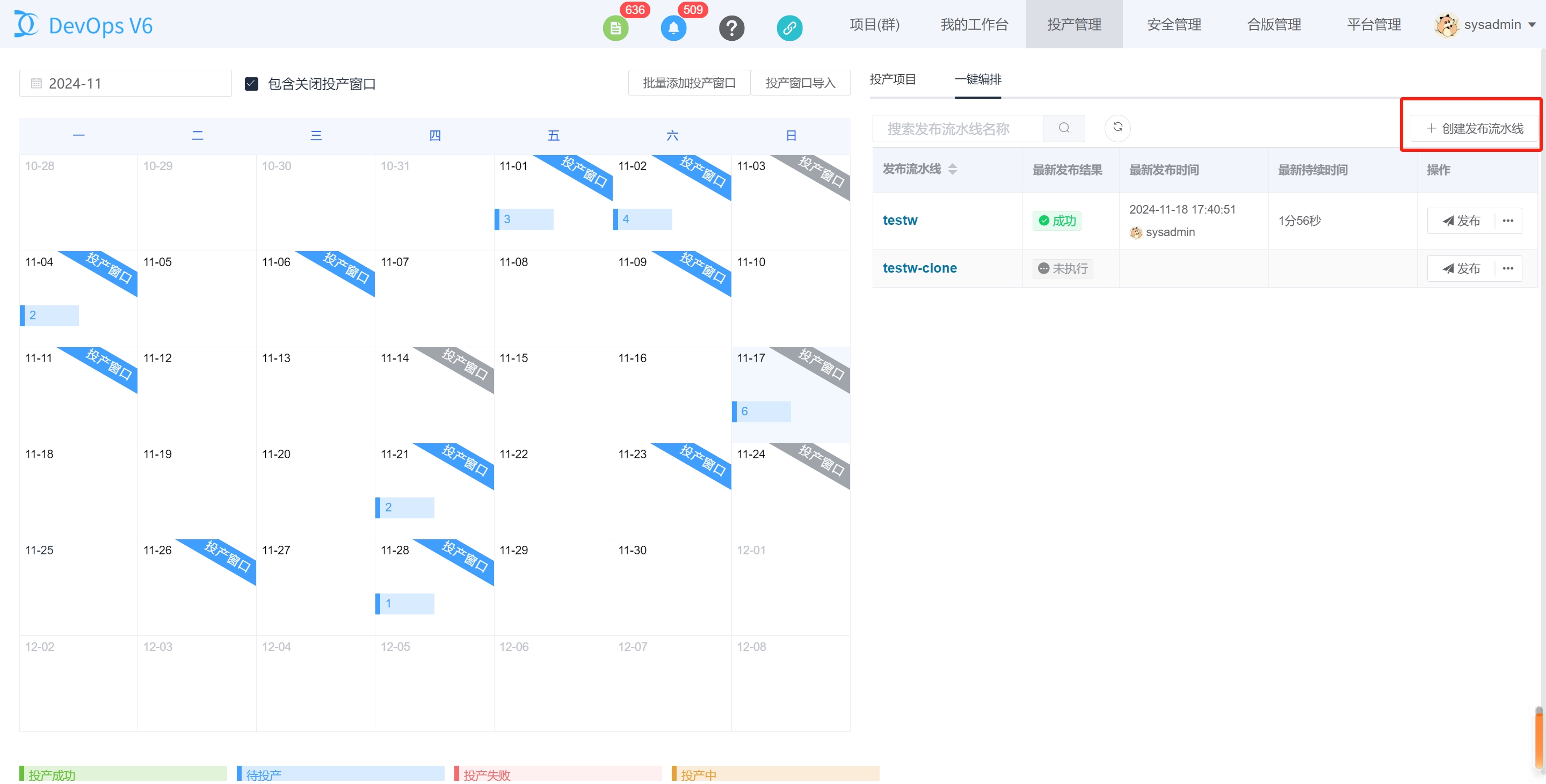 选中一个投产窗口,点击一键编排table页,点击创建发布流水线按钮创建一条一键发布流水线。