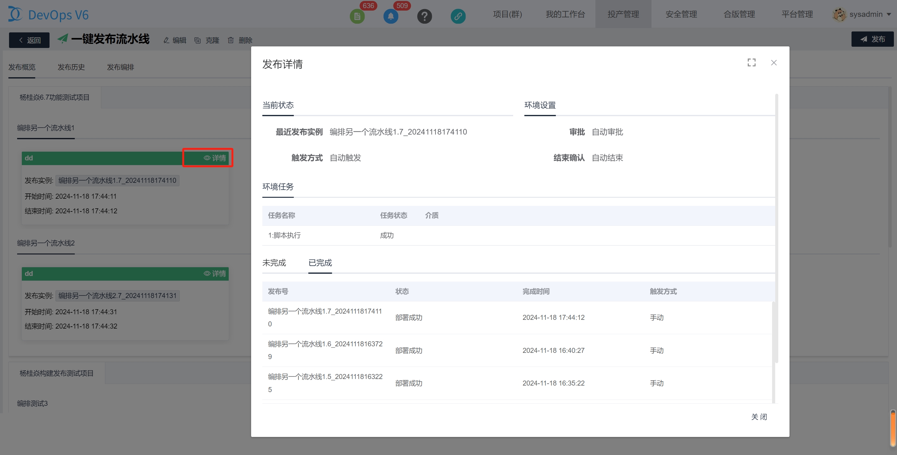 支持在投产窗口下创建投产流水线(一键发布流水线),支持所有投产项目及其发布流水线的编排串联,支持投产流水线执行及进度跟踪,执行过程支持人工介入(跳过,中止)。