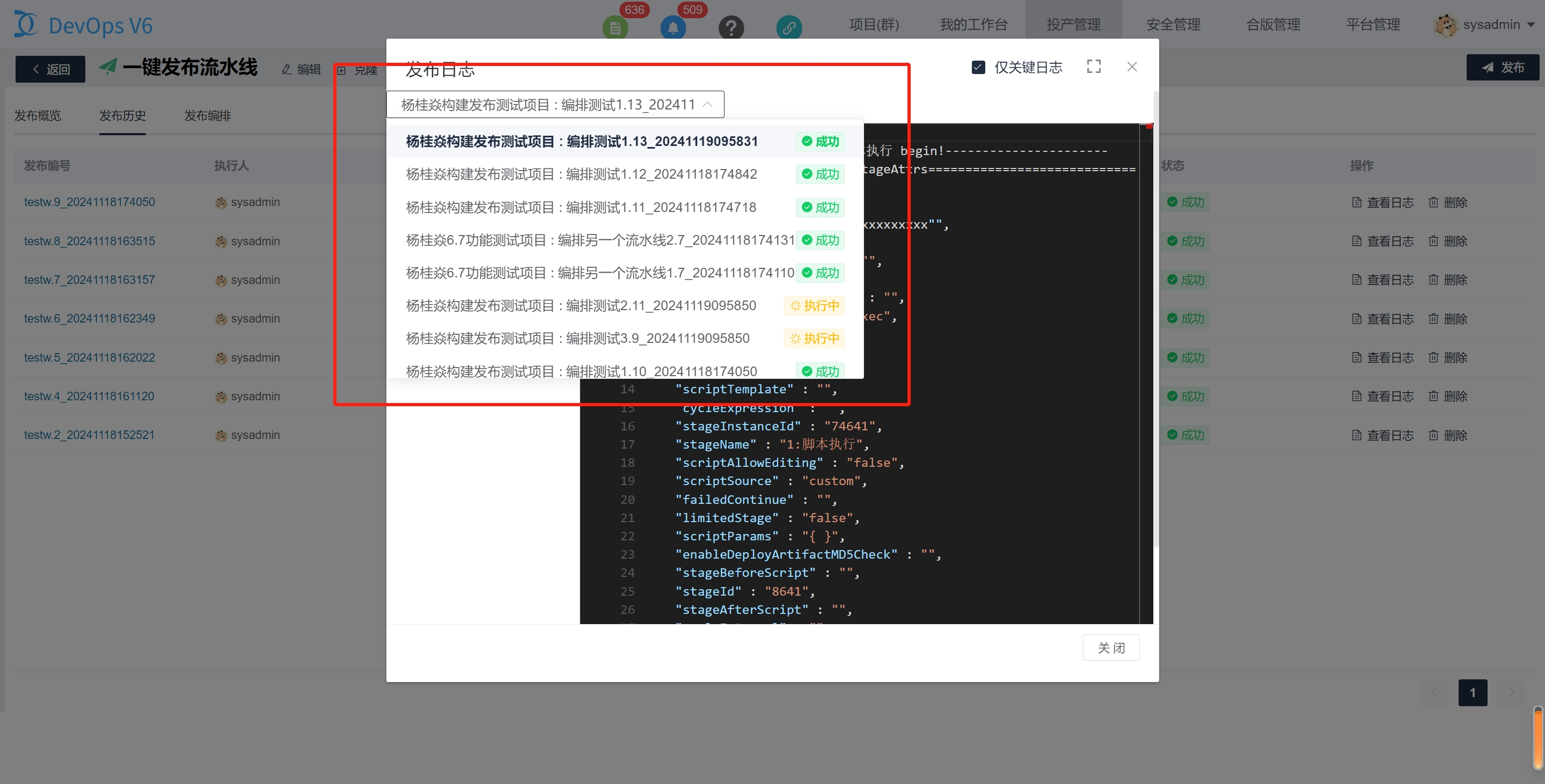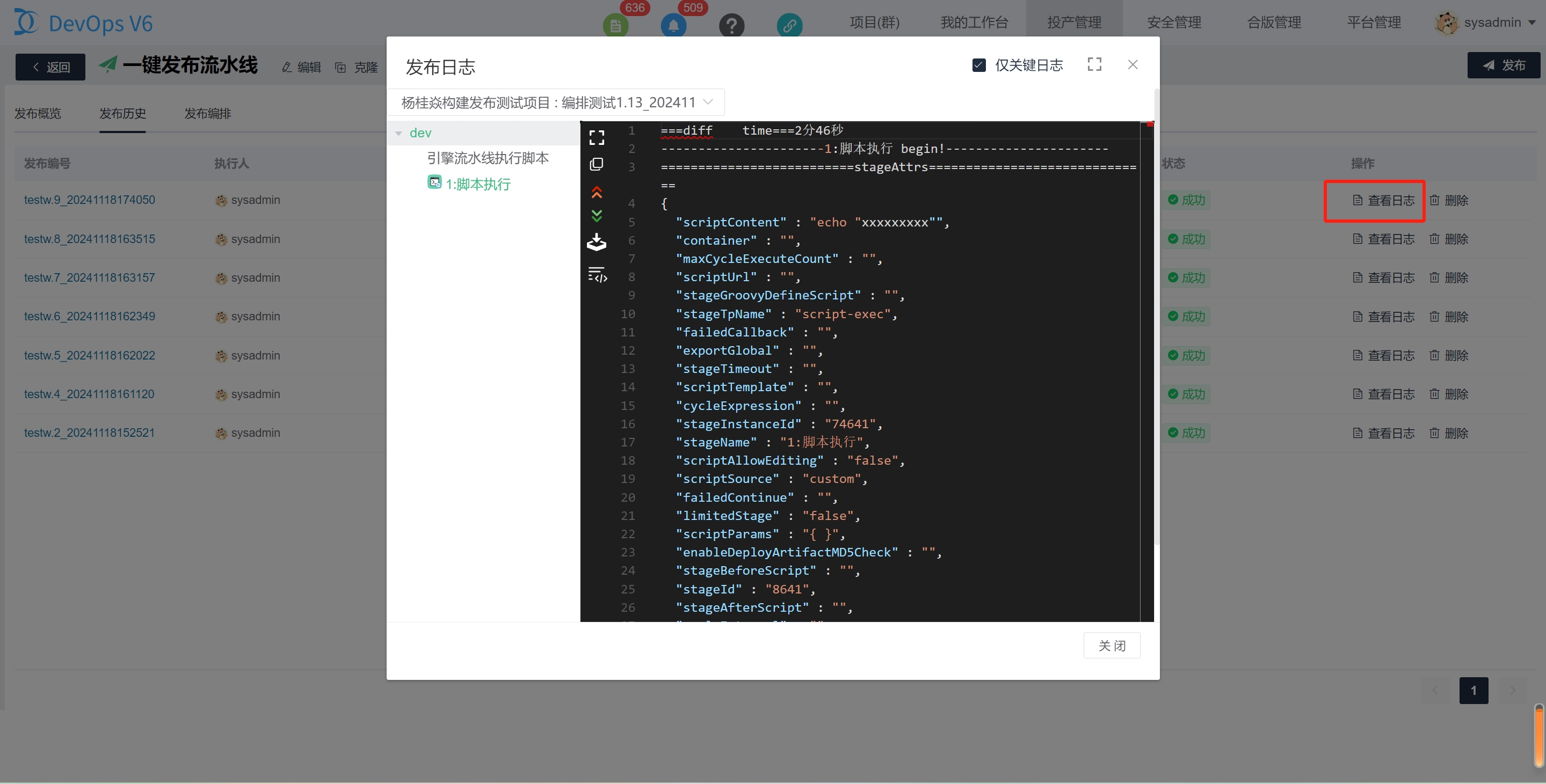 每个发布关联流水线都可以看到一个文本的按钮,点击该按钮可以查看当前关联流水线的日志信息。