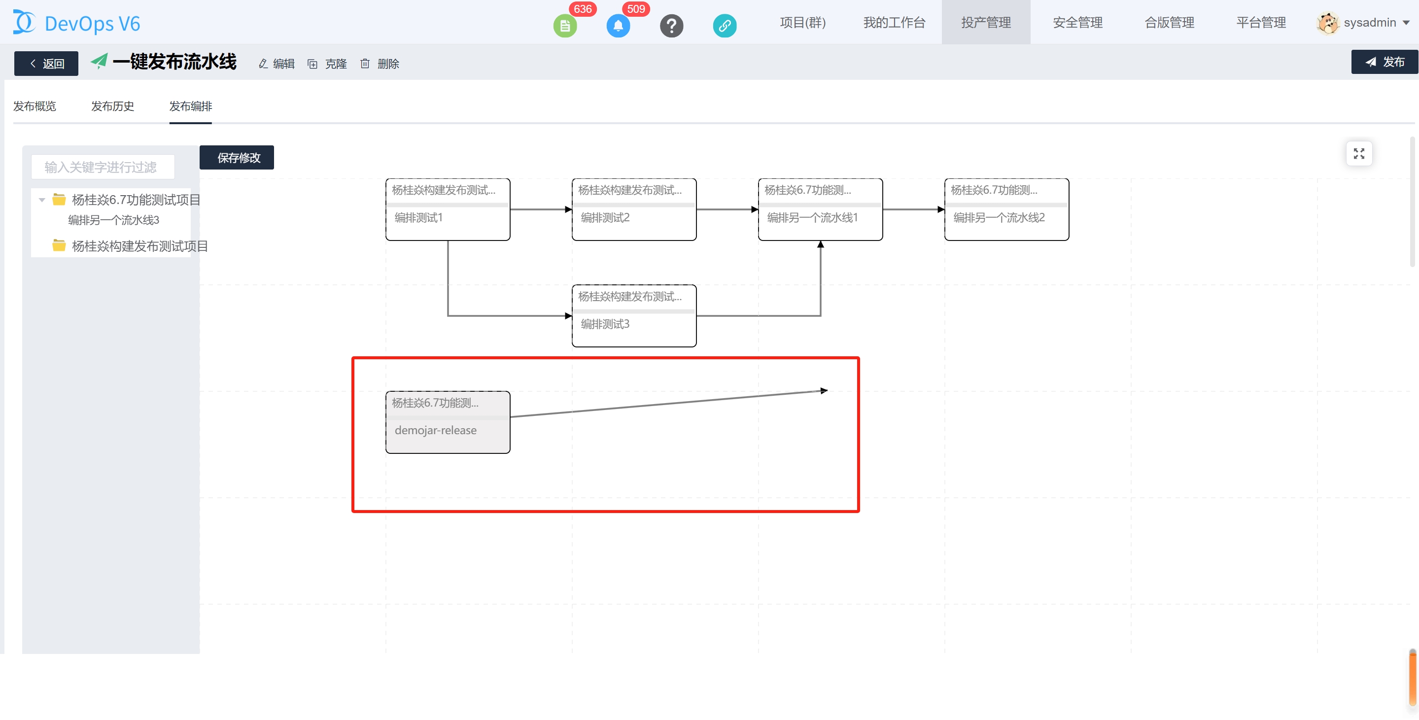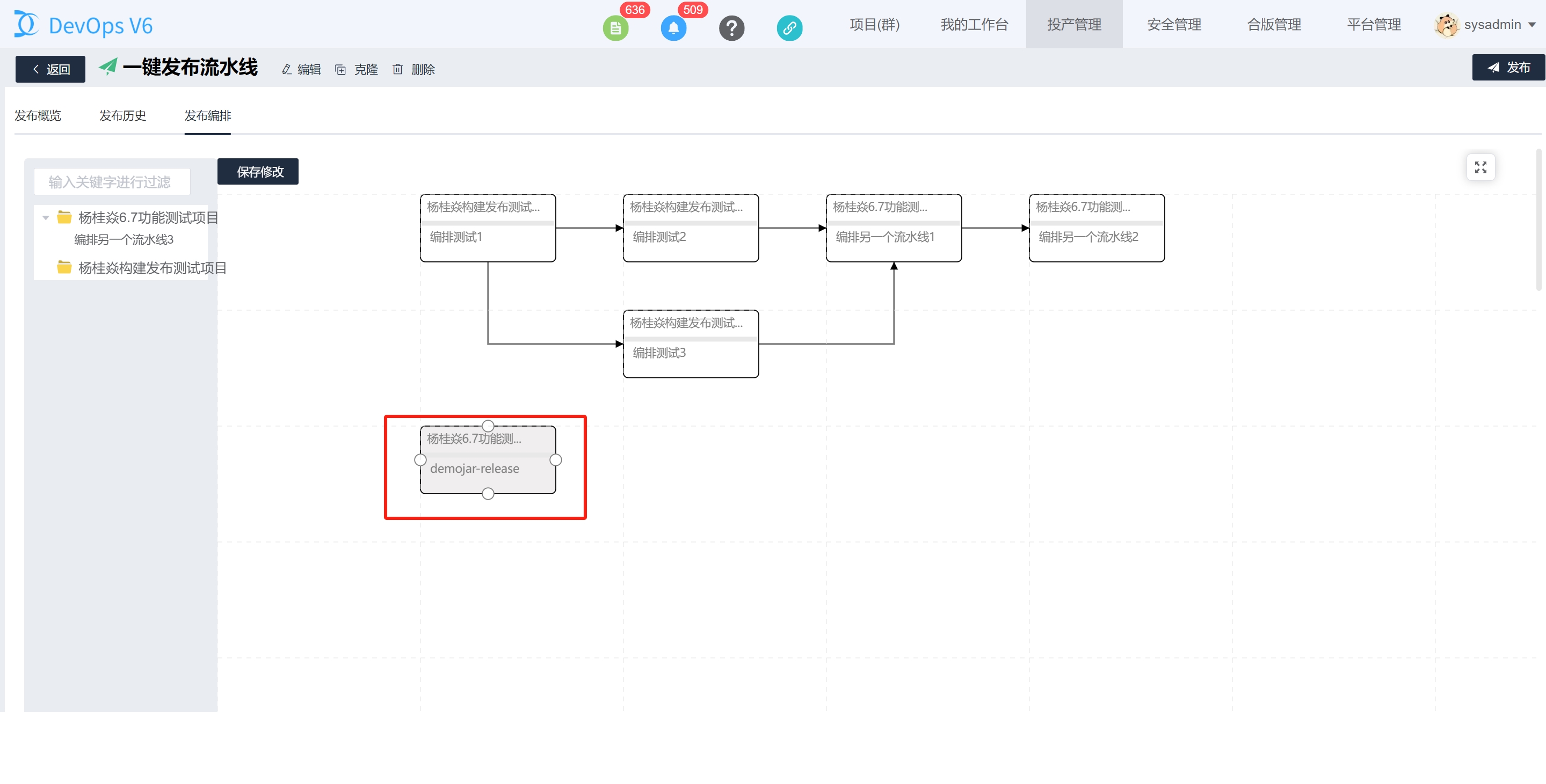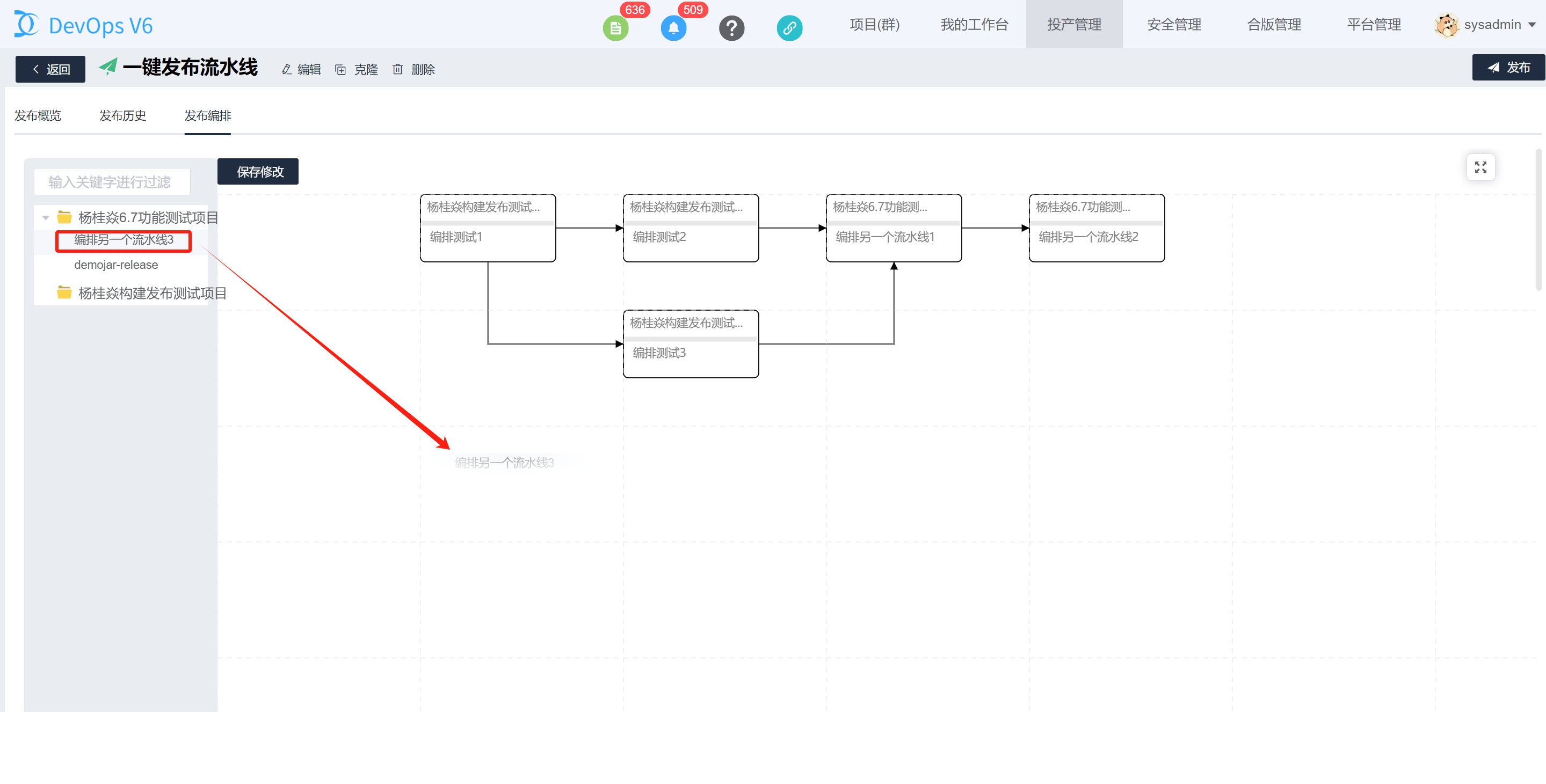 选中项目关联的发布流水线,可以拖拽到中间的编排工作台。