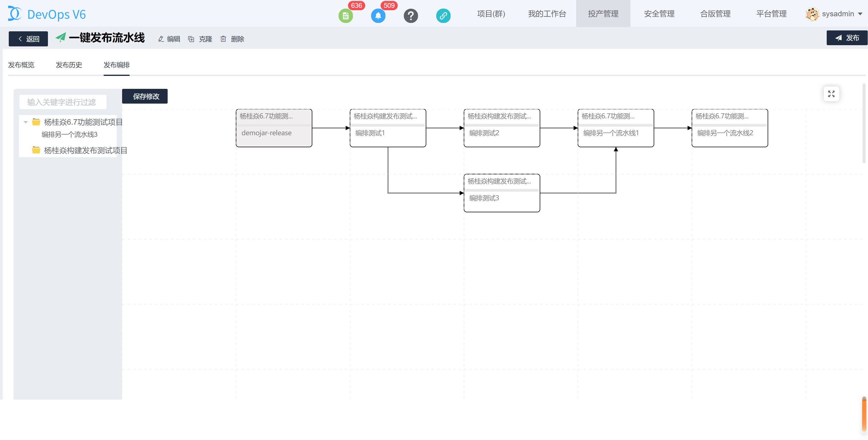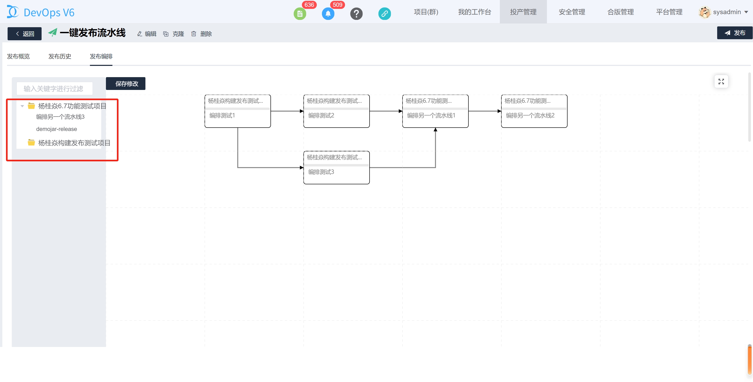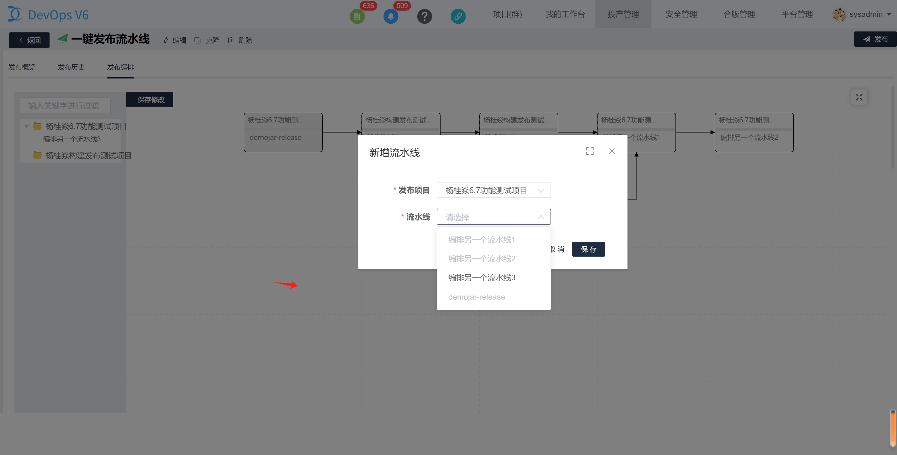 选中项目关联的发布流水线,可以拖拽到中间的编排工作台。
