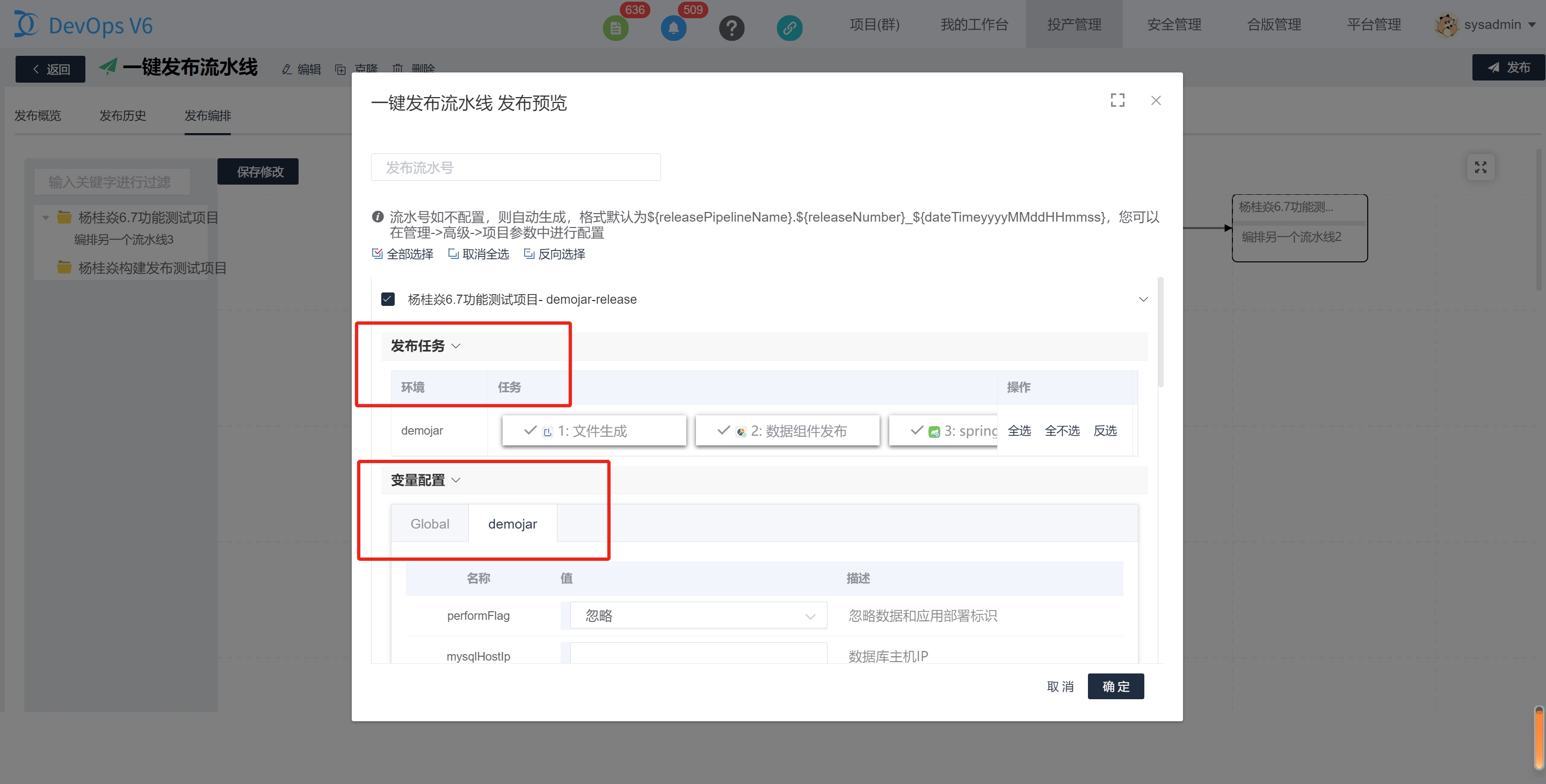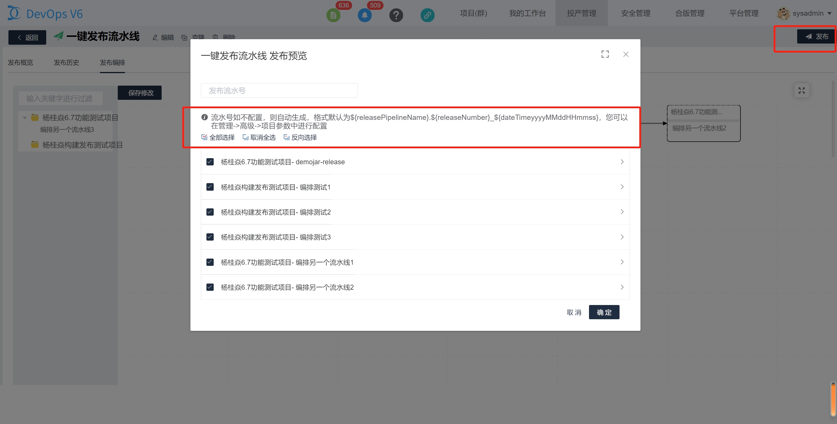 点击发布按钮即可弹出一键发布编排的流水线的发布预览界面。