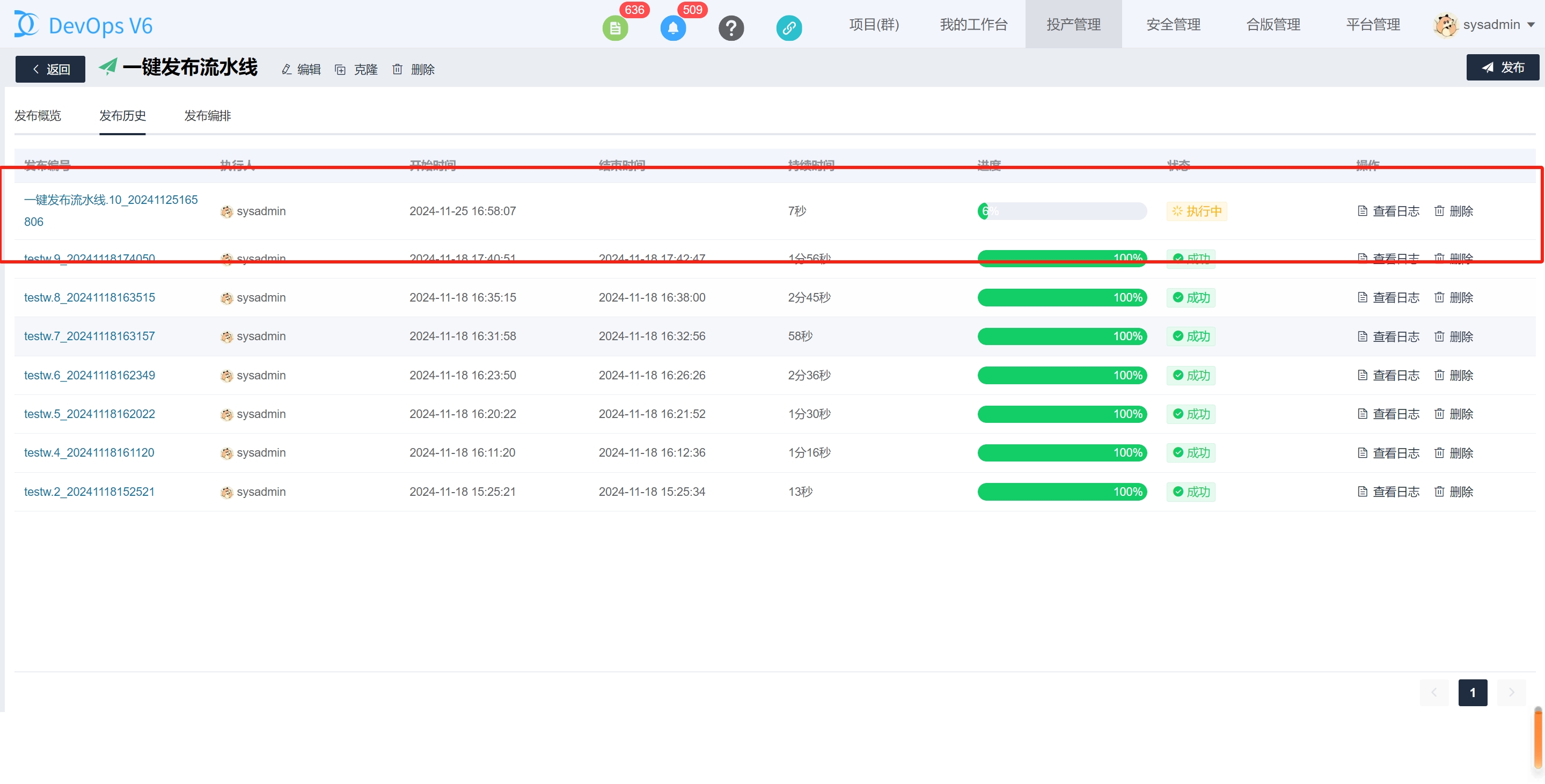 点击发布历史table页,可以查看到刚刚点击发布后运行中的流水线信息以及历史发布数据。